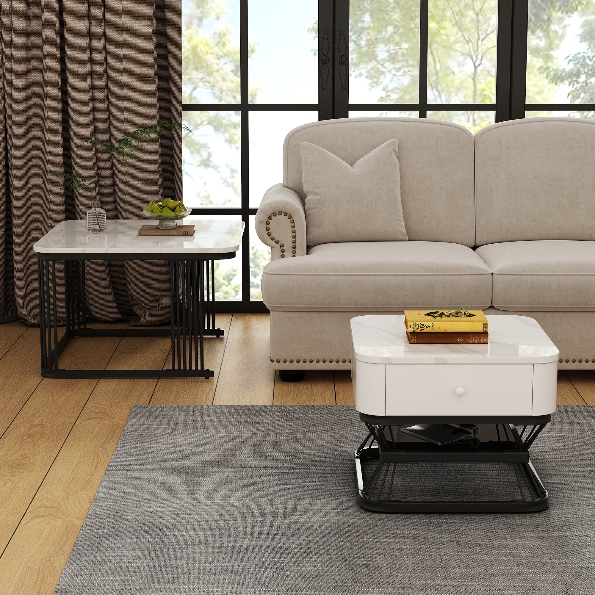 2-Piece Geometric Coffee Table Set with Drawer, High-Gloss Marble Look, White/Black