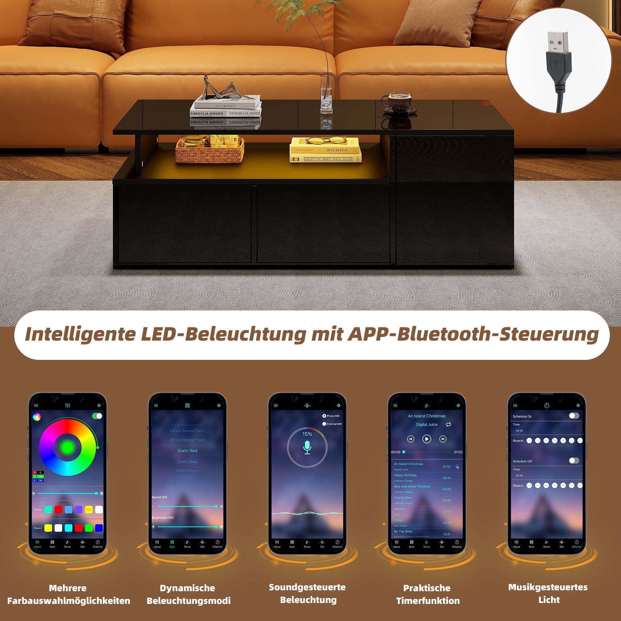 Overall dimensions: 100 x 50 x 35 cm, coffee table, high-gloss tea table (high-gloss finish applies to the top, front, and back of the table; please refer to the layout diagram), LED light strip controllable via mobile app, creates a living room atmosphere, three-tiered structure with two drawers, the middle shelf is a semi-open structure, plus a top platform, three storage compartments on one side of the tea table, excellent storage capacity, black, particleboard material, total load capacity 60 kg