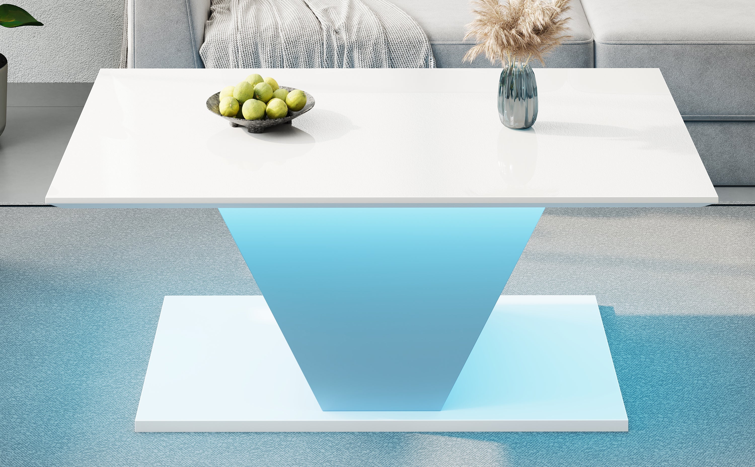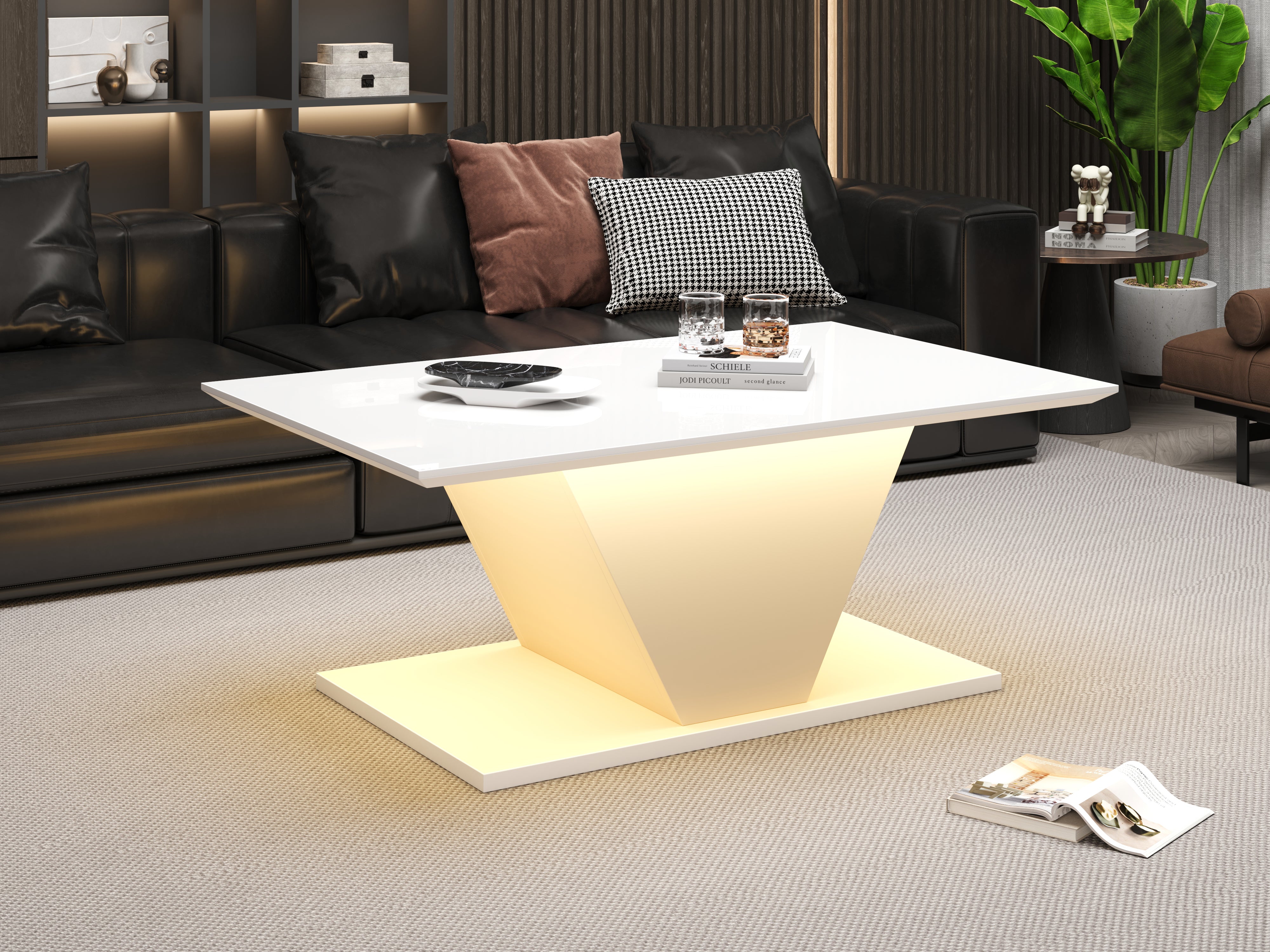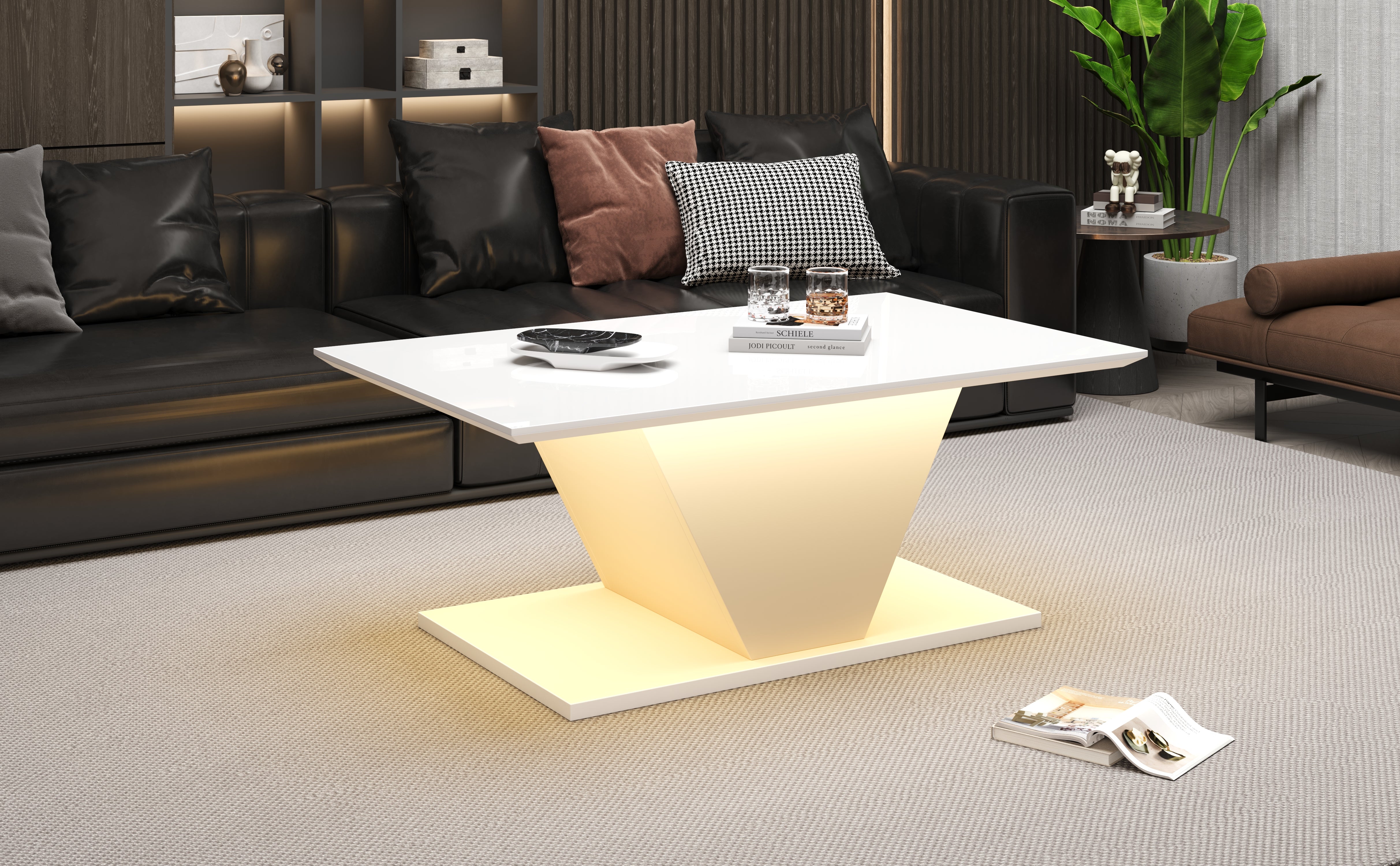 The unique shape and white design perfectly complement a modern, minimalist style. An integrated LED light strip harmonizes with the white coffee table, creating an elegant ambiance and adding a touch of mystery to your living room.