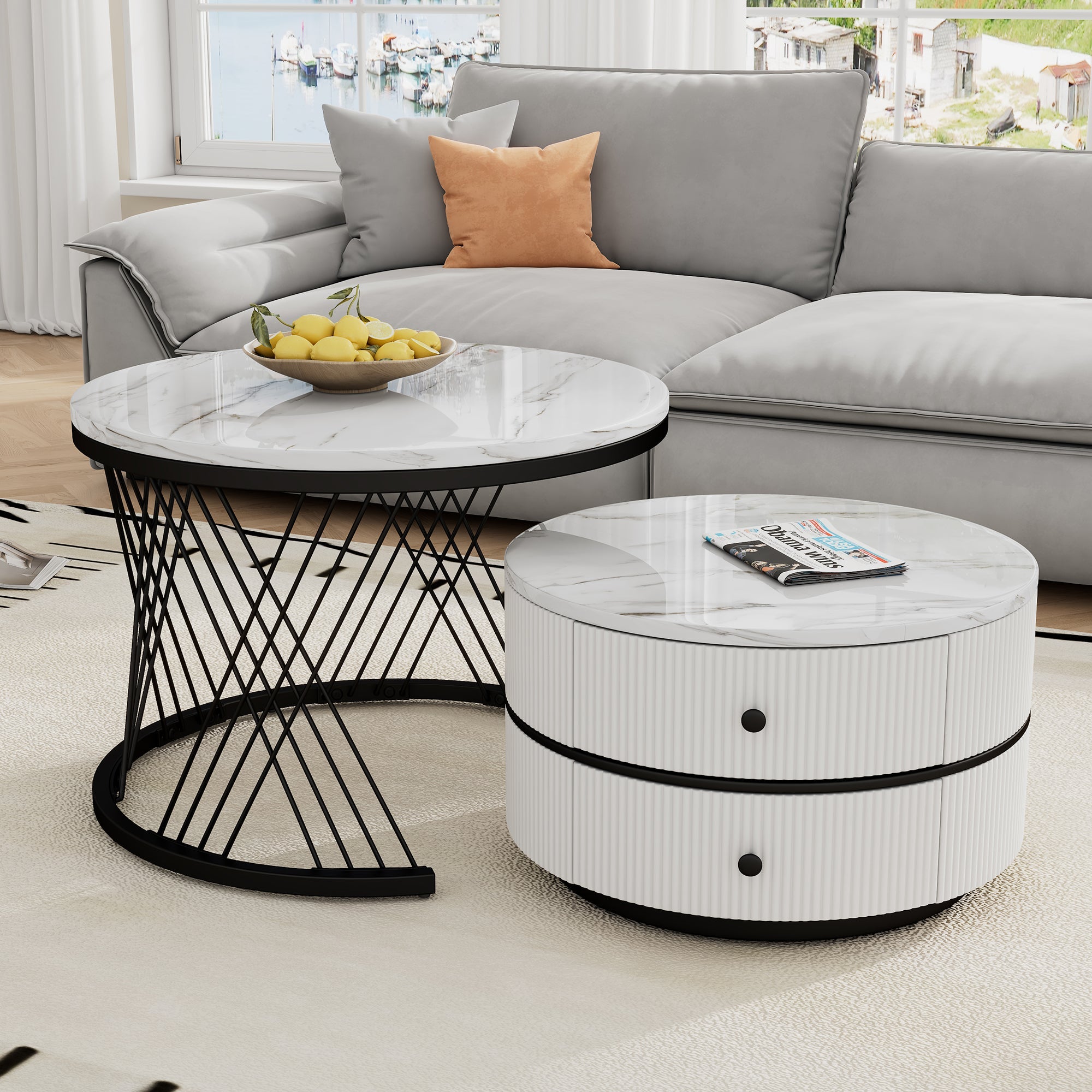 Elegant 2-Piece Nesting Coffee Table Set, Round High-Gloss Marble Look with 2 Drawers, White