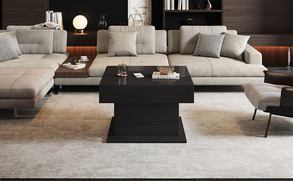 Geometric Coffee Table, 360° Rotate Lift-Top Storage, High-Gloss Black