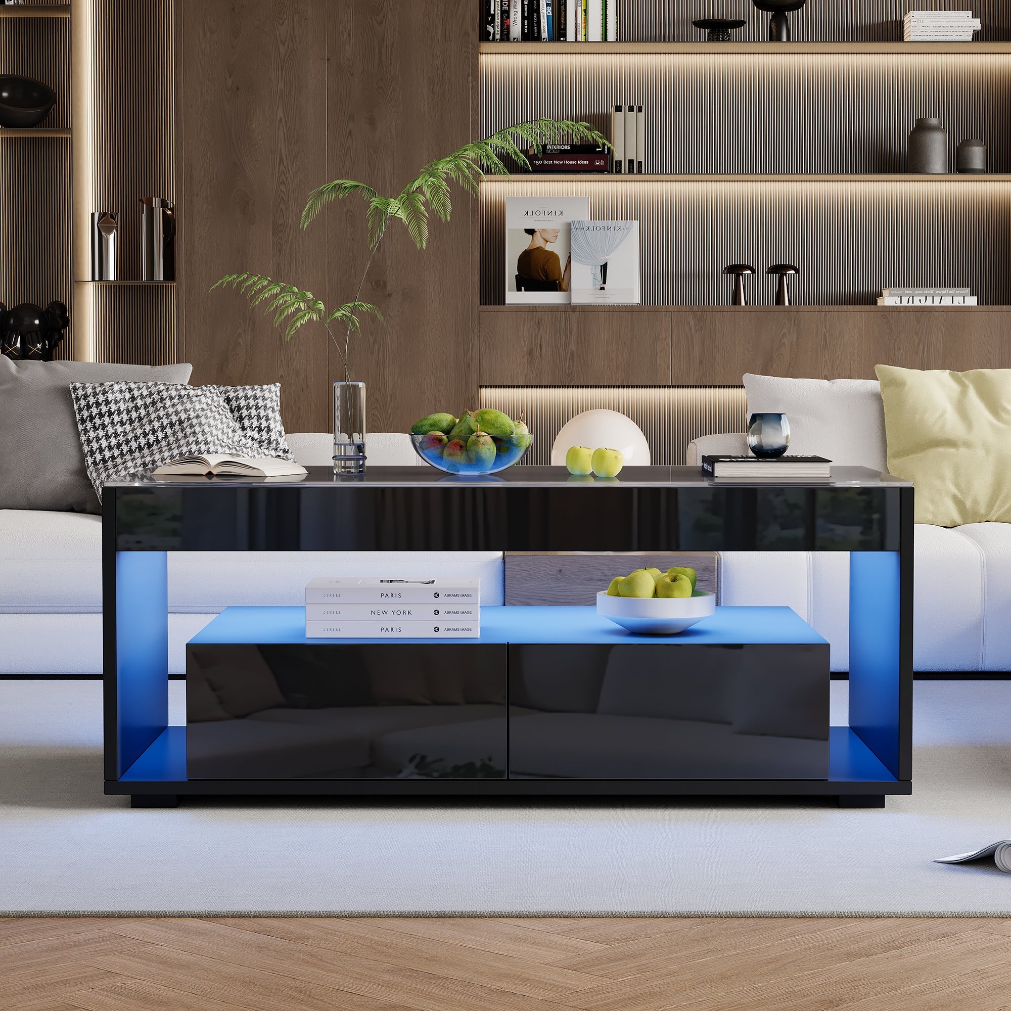 Modern Coffee Table, 16-Color LED Light, 2 Large Drawers, High Gloss, Black