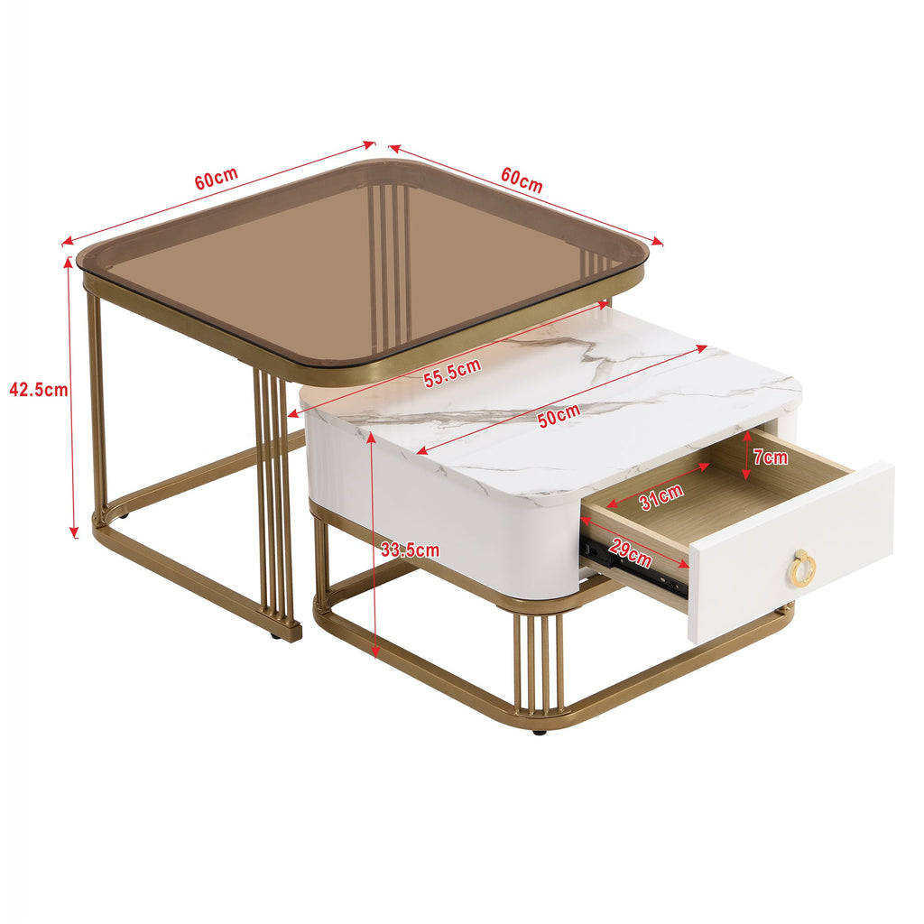 This stylish modular coffee table set includes a large table and a small table, designed for versatile use either together or separately. The large table measures 60 x 60 x 42.5 cm, and the small table measures 50 x 50 x 34 cm. The small table boasts a high-gloss marble top, while the large table features a rich brown glass top. These elements, combined with elegant gold metal frames, create a luxurious and sophisticated aesthetic. For enhanced convenience and functionality, the small table is equipped with practical drawers and sturdy three-part rails. A user-friendly gold handle ensures ease of use and beautifully complements the luxurious design.