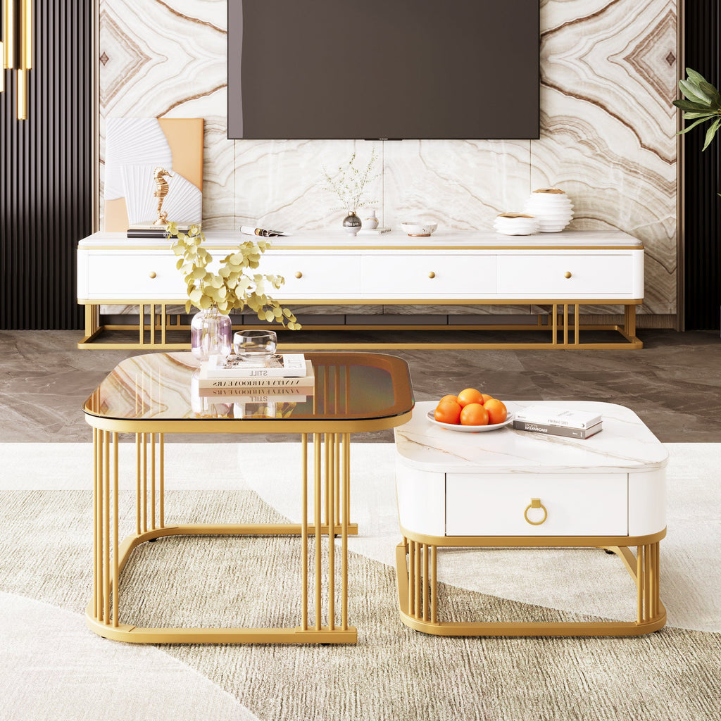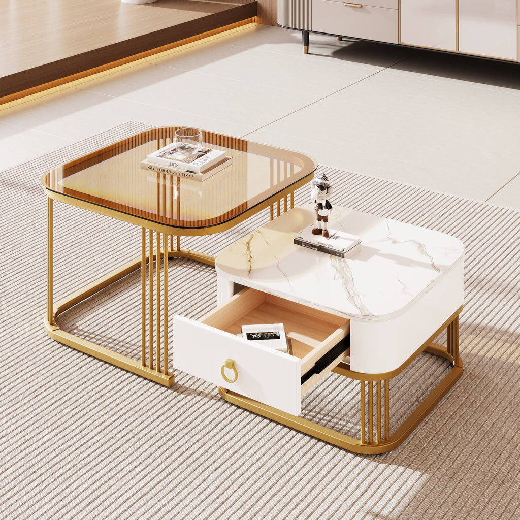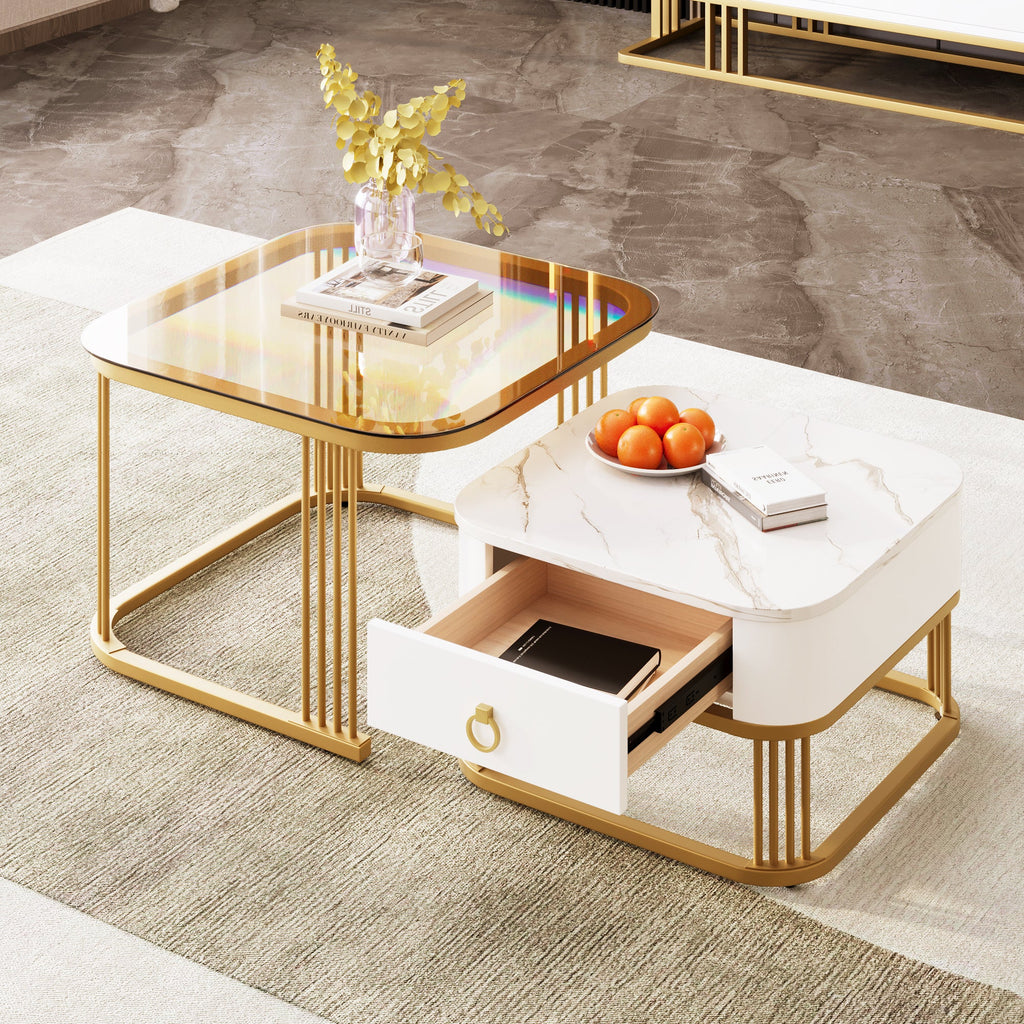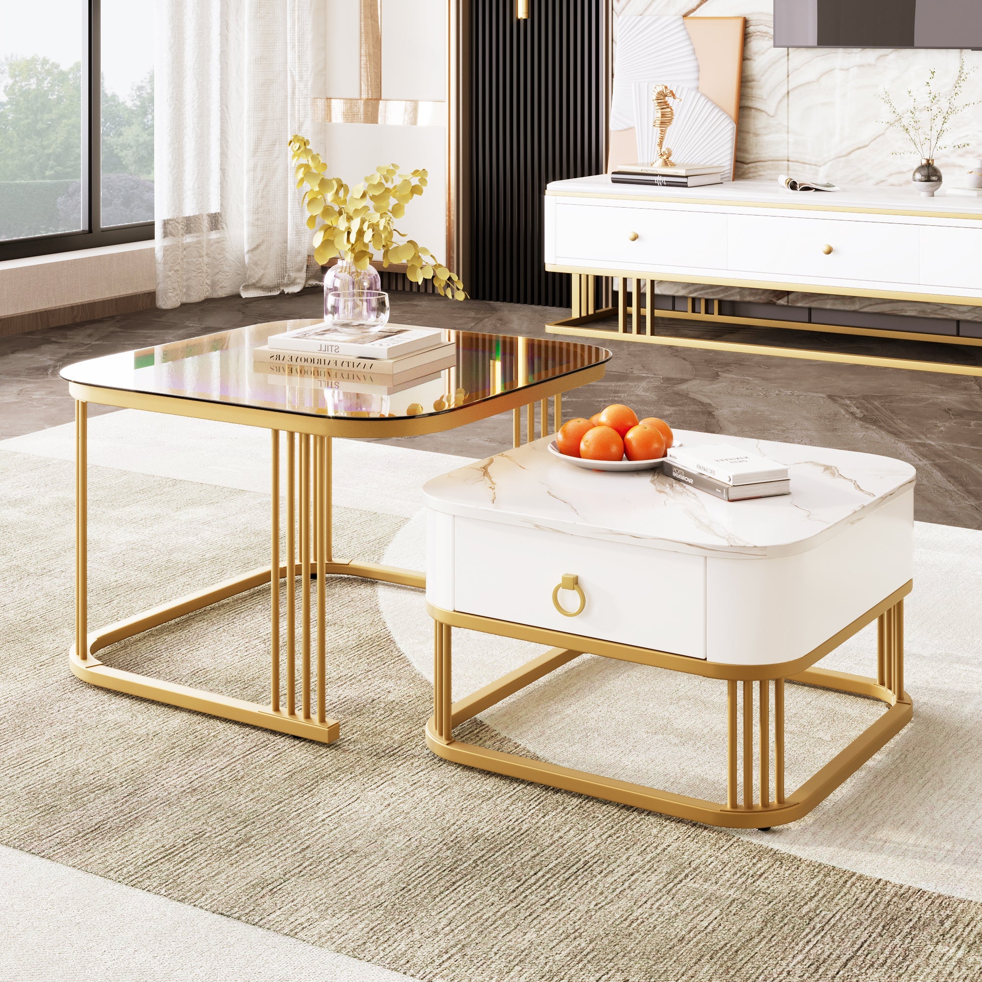Stackable Coffee Table: High-Gloss Marble, Tea-Brown Glass, Gold Accents, Two-Piece Set