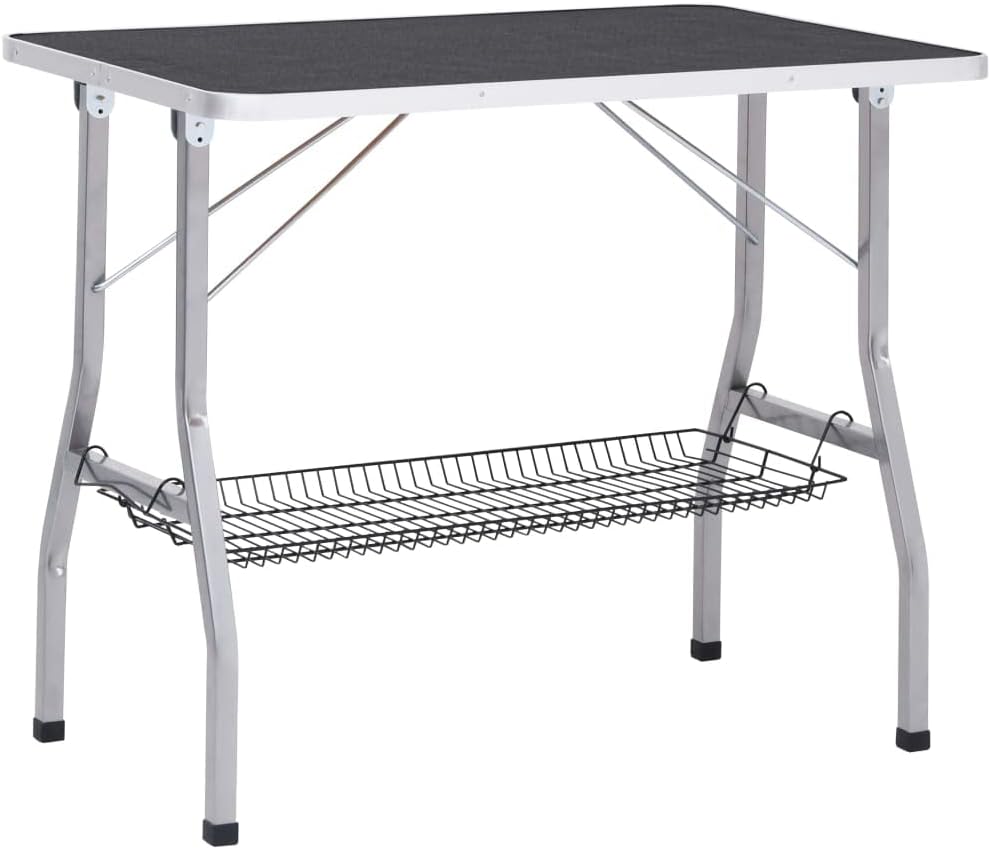 The table is foldable, making it ideal for mobile groomers and home use, as it is easy to store when not in use. A convenient basket is located under the tabletop for storing everyday pet supplies. Additionally, the rounded corners prevent injuries.