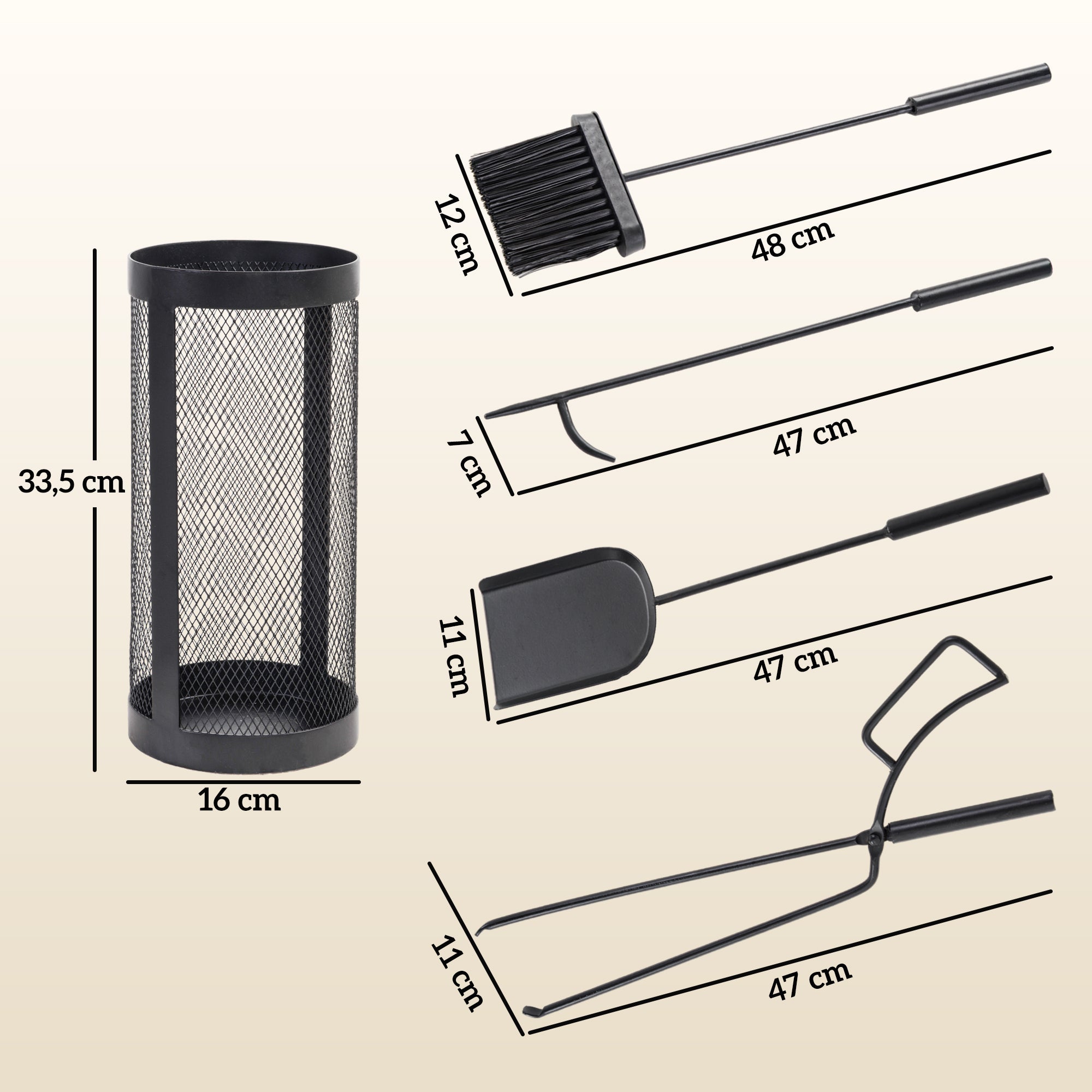 Basket size: 16 cm (diameter) x 33.5 cm (height). Length of fireplace tools: 47/48 cm. No assembly is required.