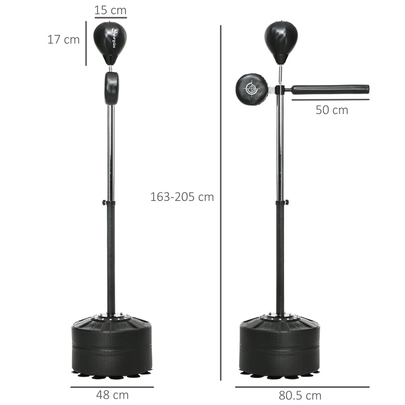 Dimensions: 163-205H x 80.5L x 48Wcm. Speedball: 15 x 17Lcm. Loading capacity of base: Water: 30kg. Sand: 35kg. Sand and water mixture: 40kg. An air pump is included. Assembly is required.