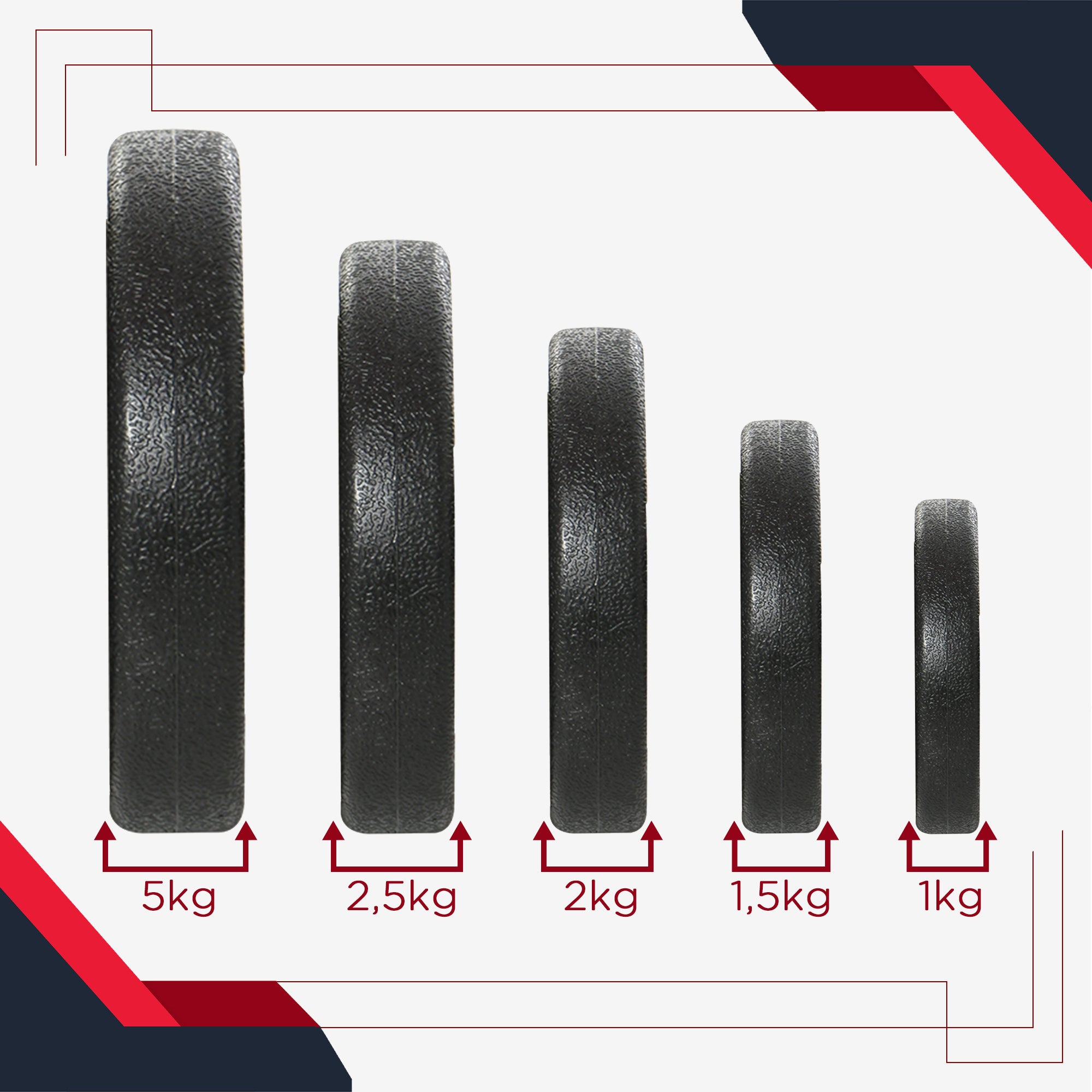 Product details: Overall dimensions: 43 cm x 18 cm x 7.5 cm. Connecting rod size: 2.5 x 45 cm. 2.5 kg dumbbell size: 21 x 4 cm. 1.5 kg dumbbell size: 18 x 3 cm.