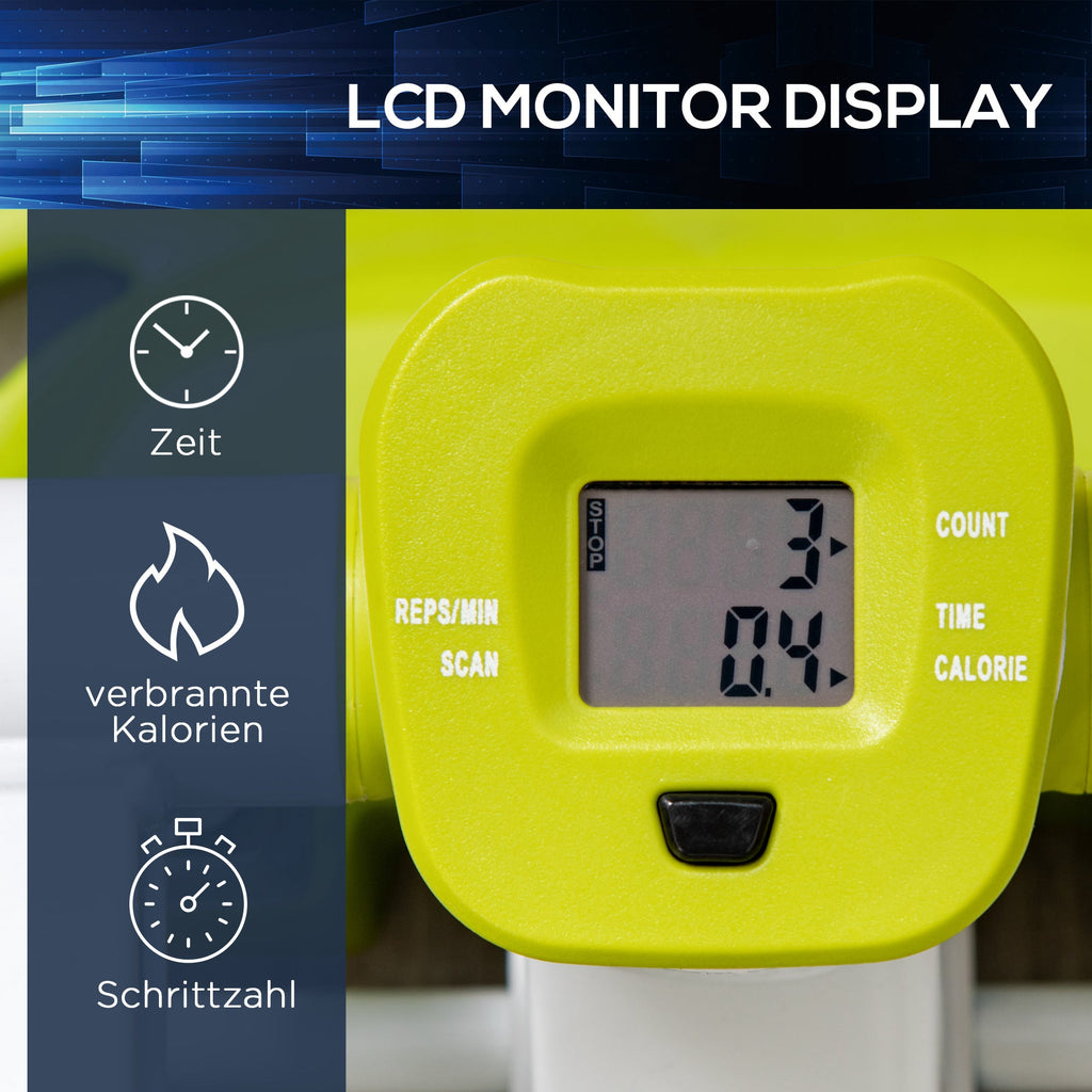 Integrated LCD monitor: Keep track of your progress! The mini stepper's LCD display shows you the time, number of steps, and calories burned, perfect for optimizing your workout.