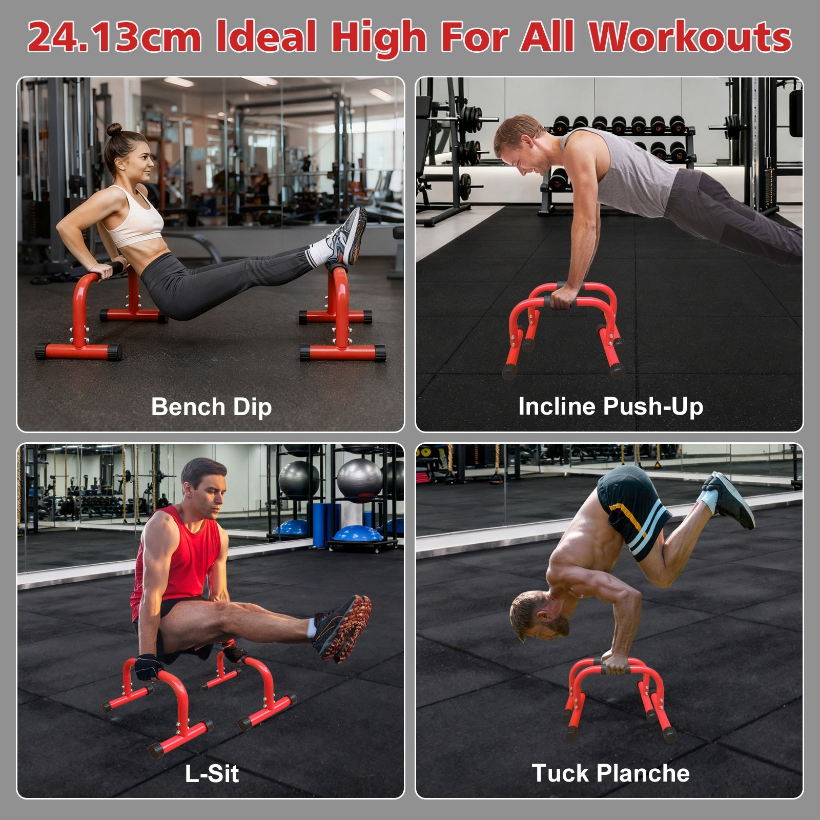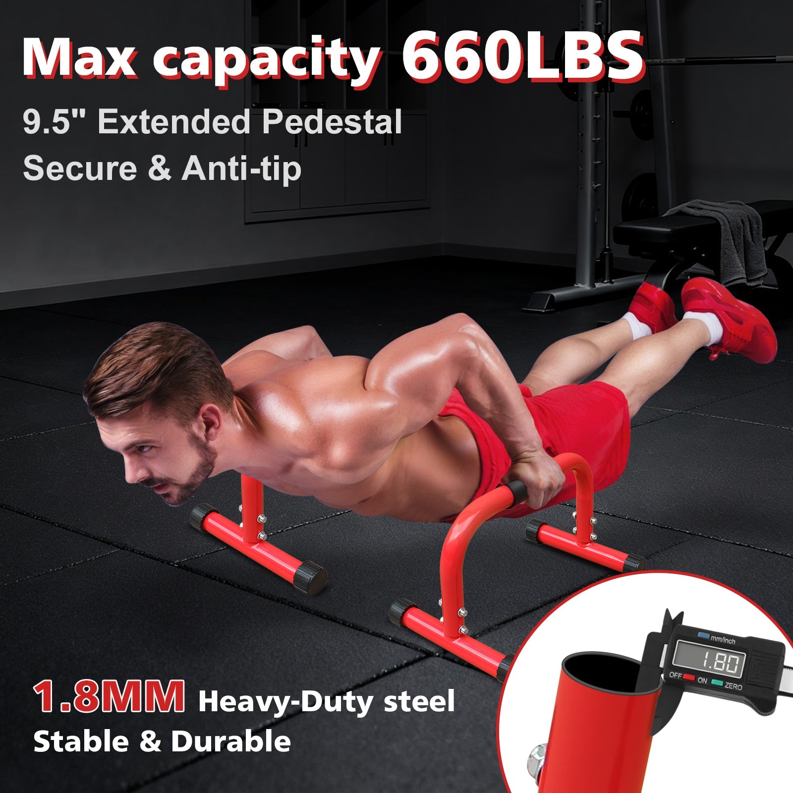 The parallettes bar measures L:43.2cm x W:25.4cm x H:24.1cm. The commercial thickness can fully support 300KG. The extended handle and perfect height provide the right space for you to perform dips, push-ups, V-sits, L-sits, tucks, planches, handstand push-ups, ab workouts, stretches, and many more bodyweight strength training exercises.