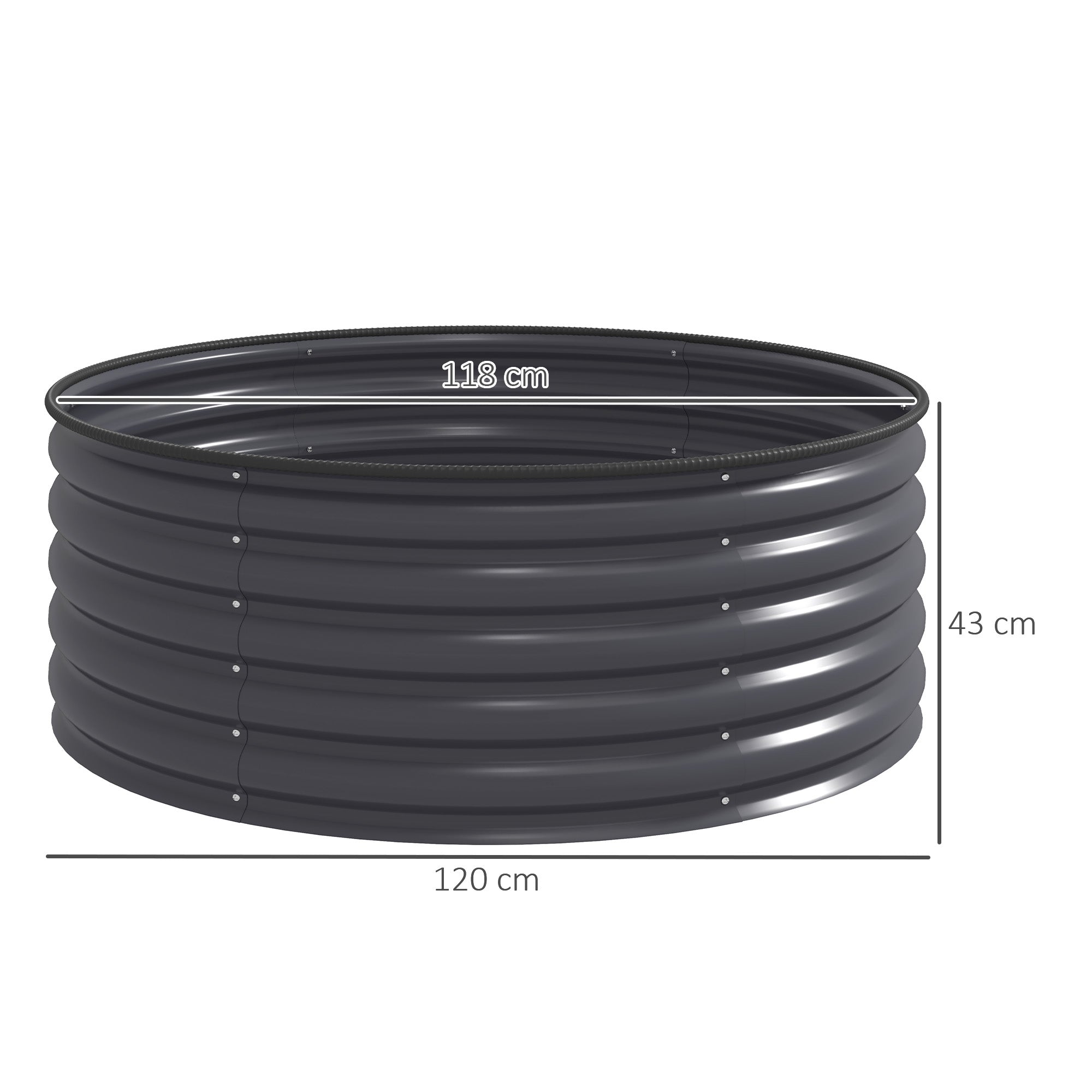 Garden bed information: Overall dimension: Φ120 x 43Hcm. Planter inner size: Φ118 x 43Hcm. Assembly required