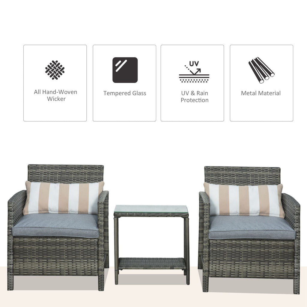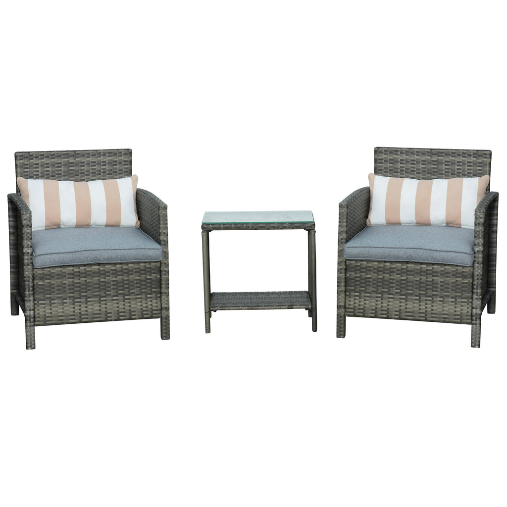 3 Pieces Rattan Bistro Set, Wicker Garden Furniture with 2-Tier Glass Top Table, Grey