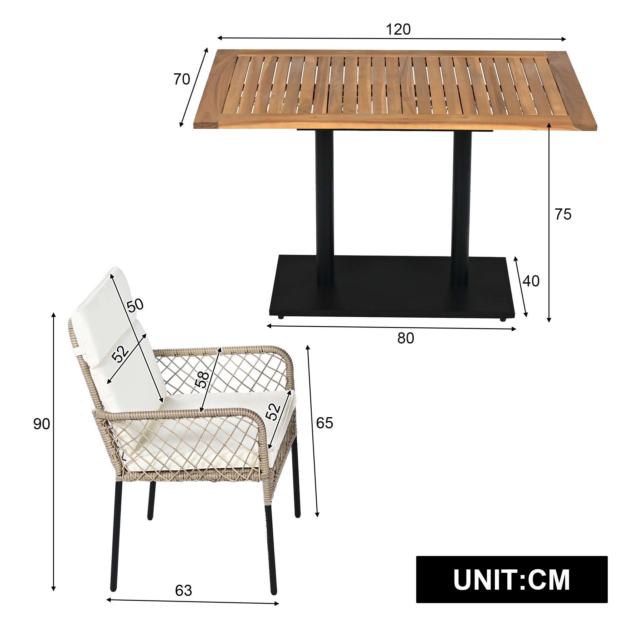 This dining set measures 120 x 70 x 75 cm, and the chairs measure 90 x 63 x 65 cm, offering ample space for cozy meals with family and friends. Whether on the terrace, in the garden, or on the balcony, this furniture set provides a stylish ambiance and maximum outdoor comfort.