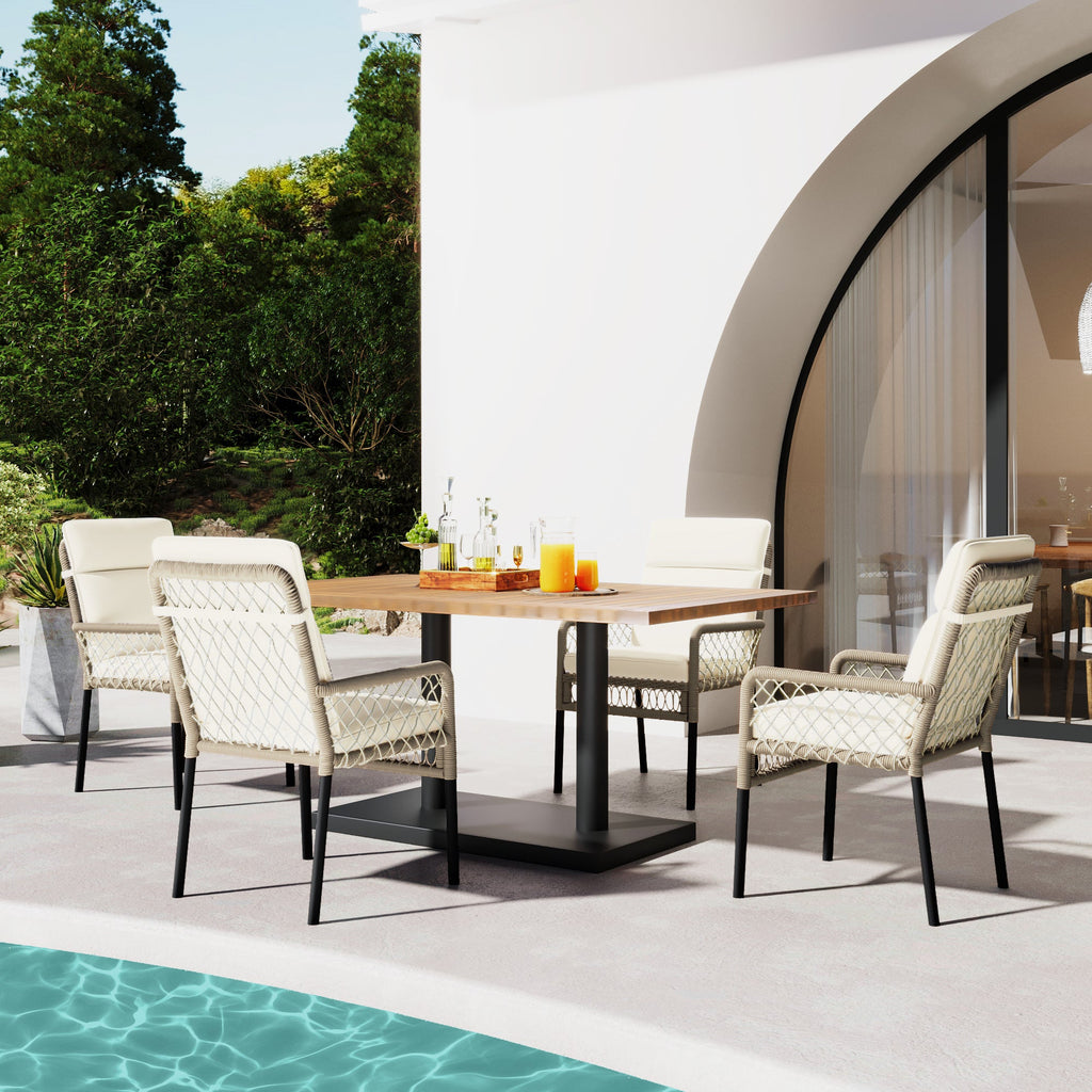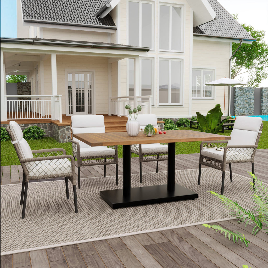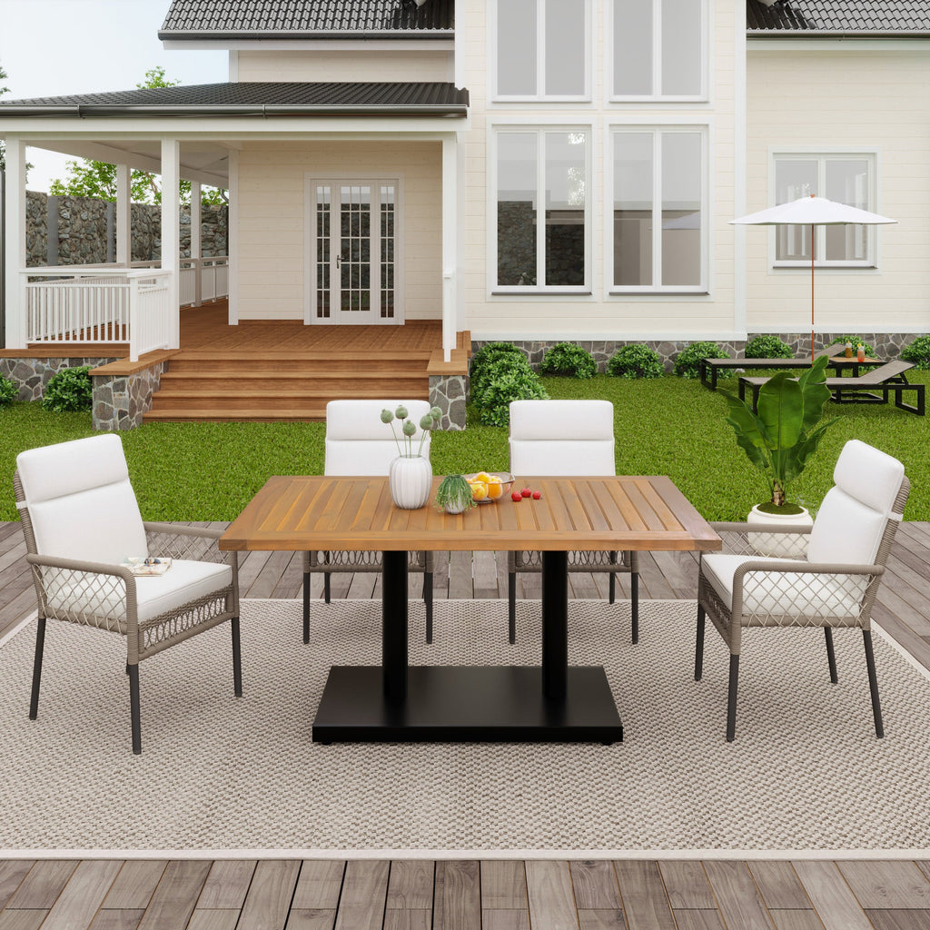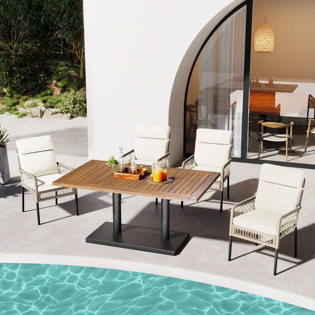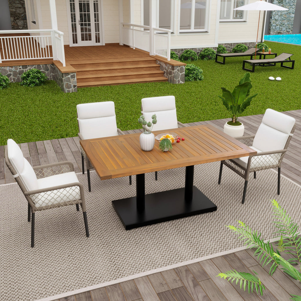 5-Piece Outdoor Dining Set, 4-Person with Acacia Wood Tabletop & PE Rattan Chairs