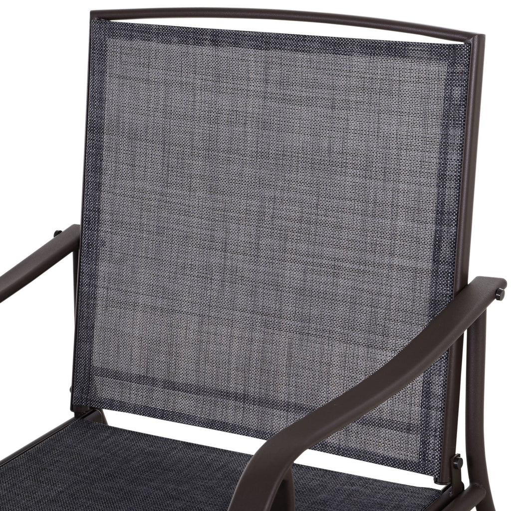 The gliding chairs smoothly and safely rock back and forth, making this bistro set ideal for relaxing in the sun. For comfort, the chairs combine an angled back, mid-rise arms, and breathable sling fabric on the back and seats.