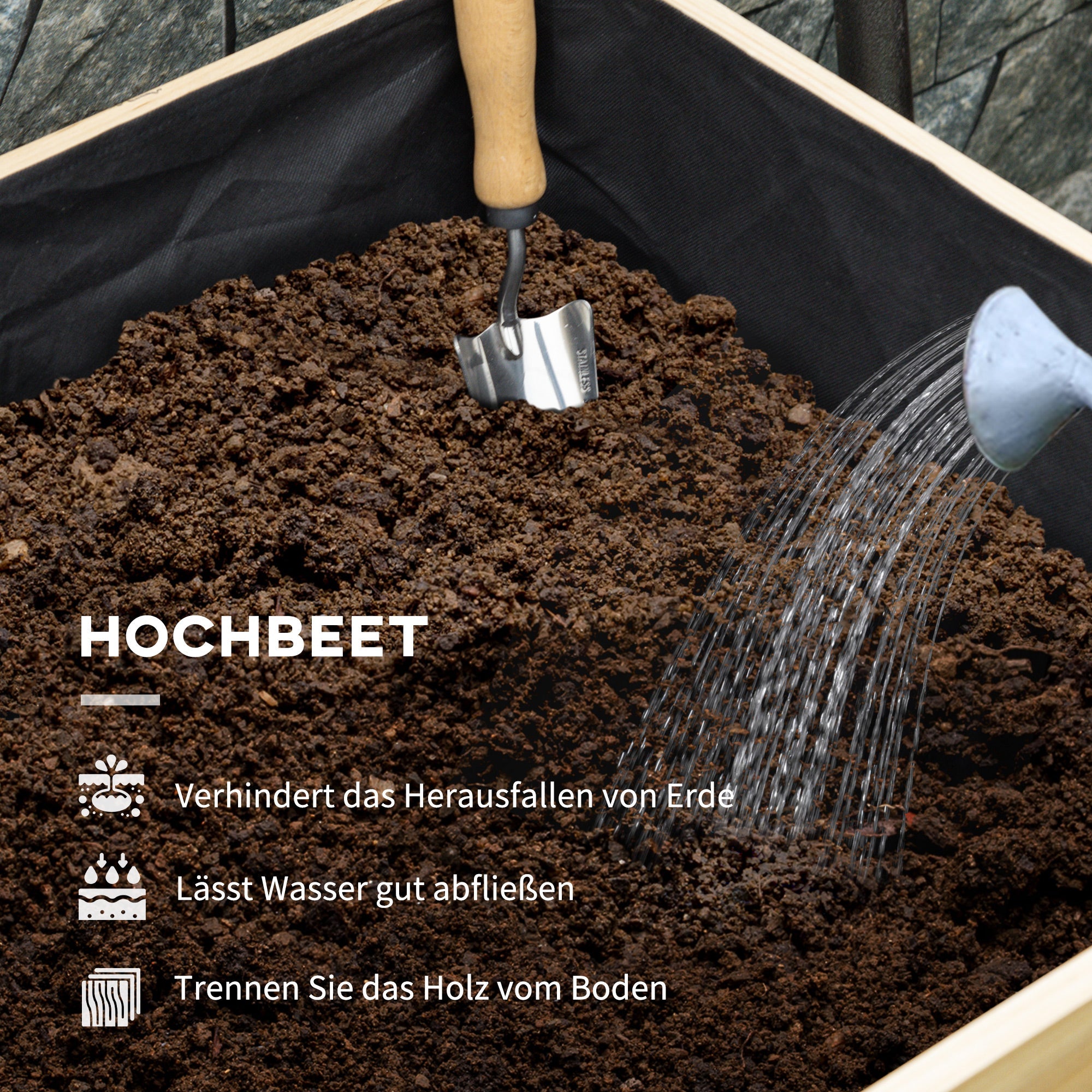 Bed lining: Equipped with a sophisticated fleece lining, this cold frame prevents potting soil from seeping through while allowing excess water to drain efficiently. It also forms a protective barrier between the wooden floor and the potting soil, helping to keep the bed in excellent condition.
