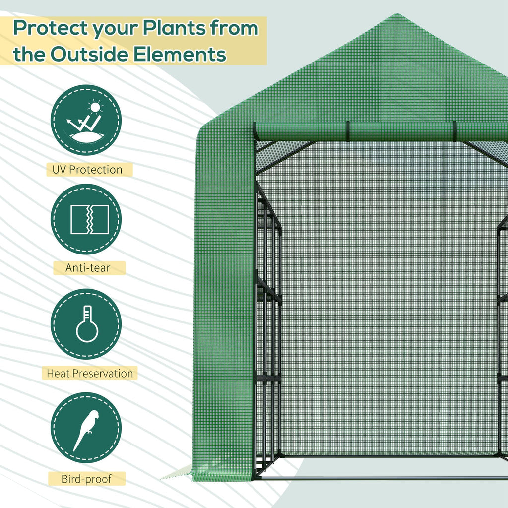 This spacious walk-in greenhouse measures 2.5 x 1.8 m (8 x 6 ft) and includes 18 inner shelves, offering plenty of space to hold fruits, vegetables, pots, and more.