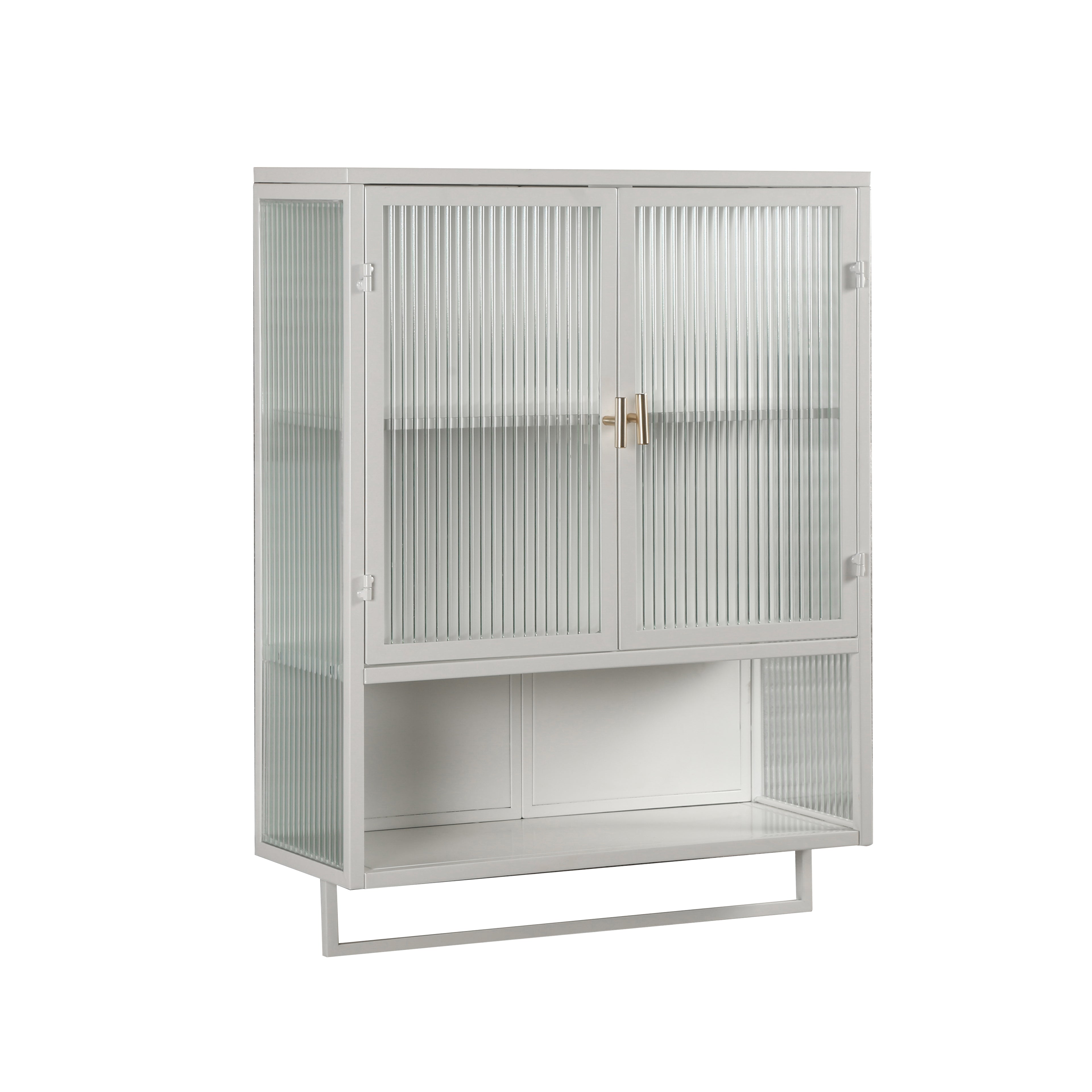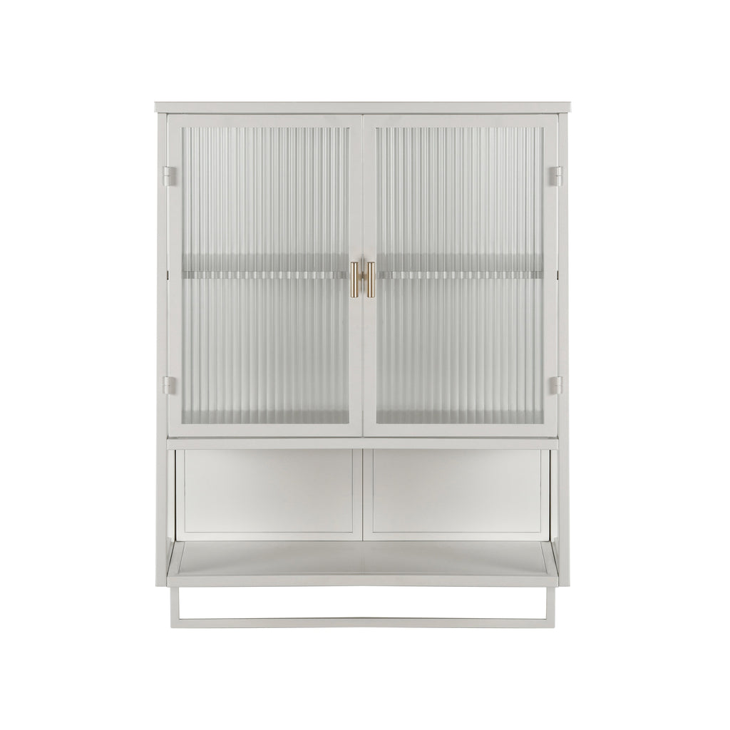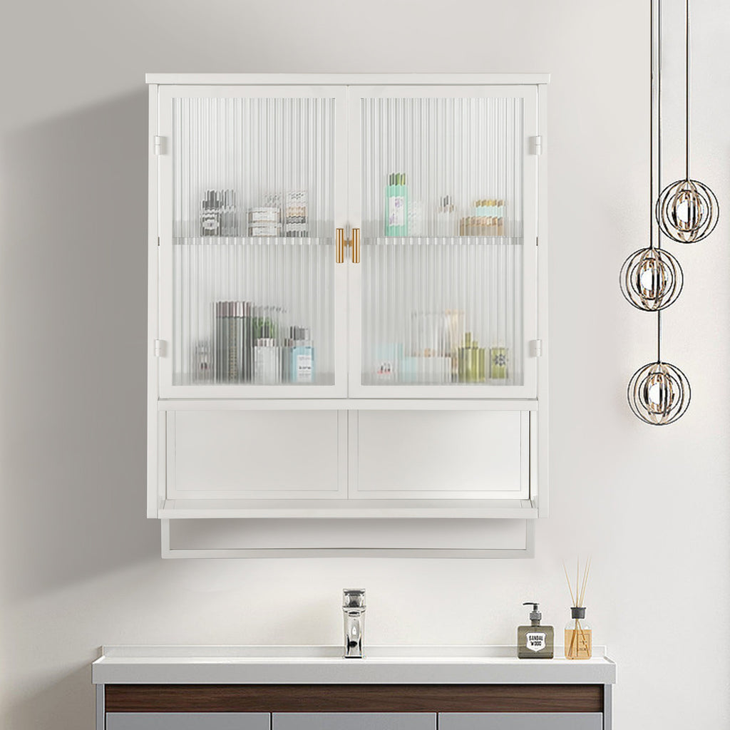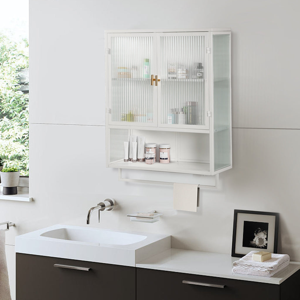 60CM Wall Cabinet with Glass Doors, Two-tier Enclosed Storage, Open Shelf, Towel Rack, White
