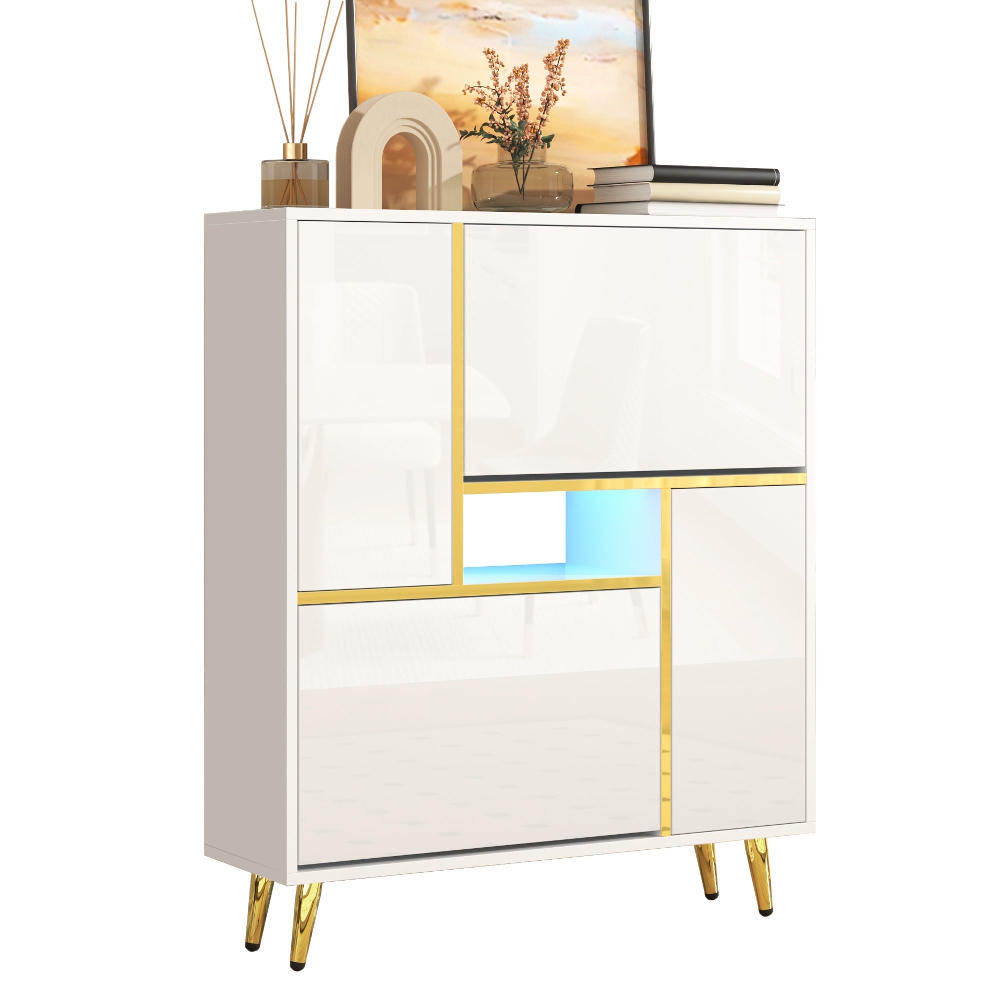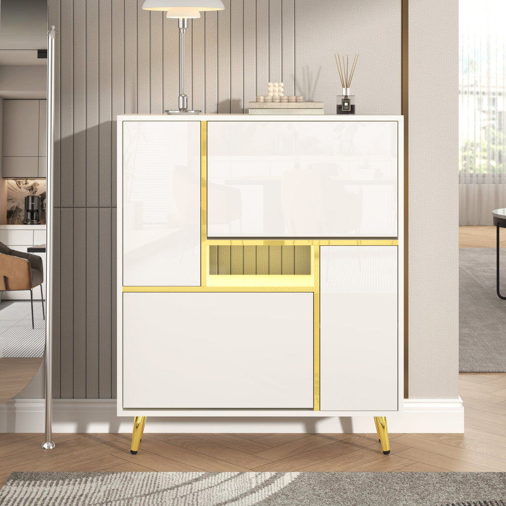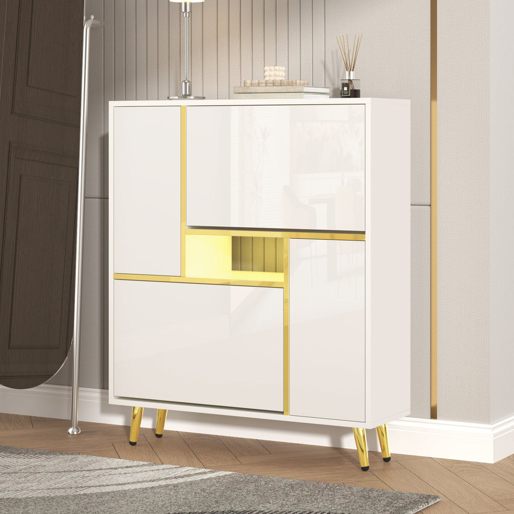 Modern Shoe Cabinet with 16-Color LED Light, White High-Gloss