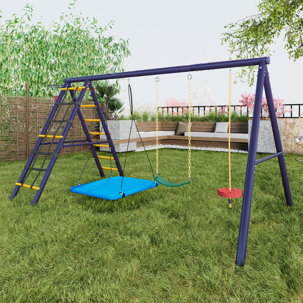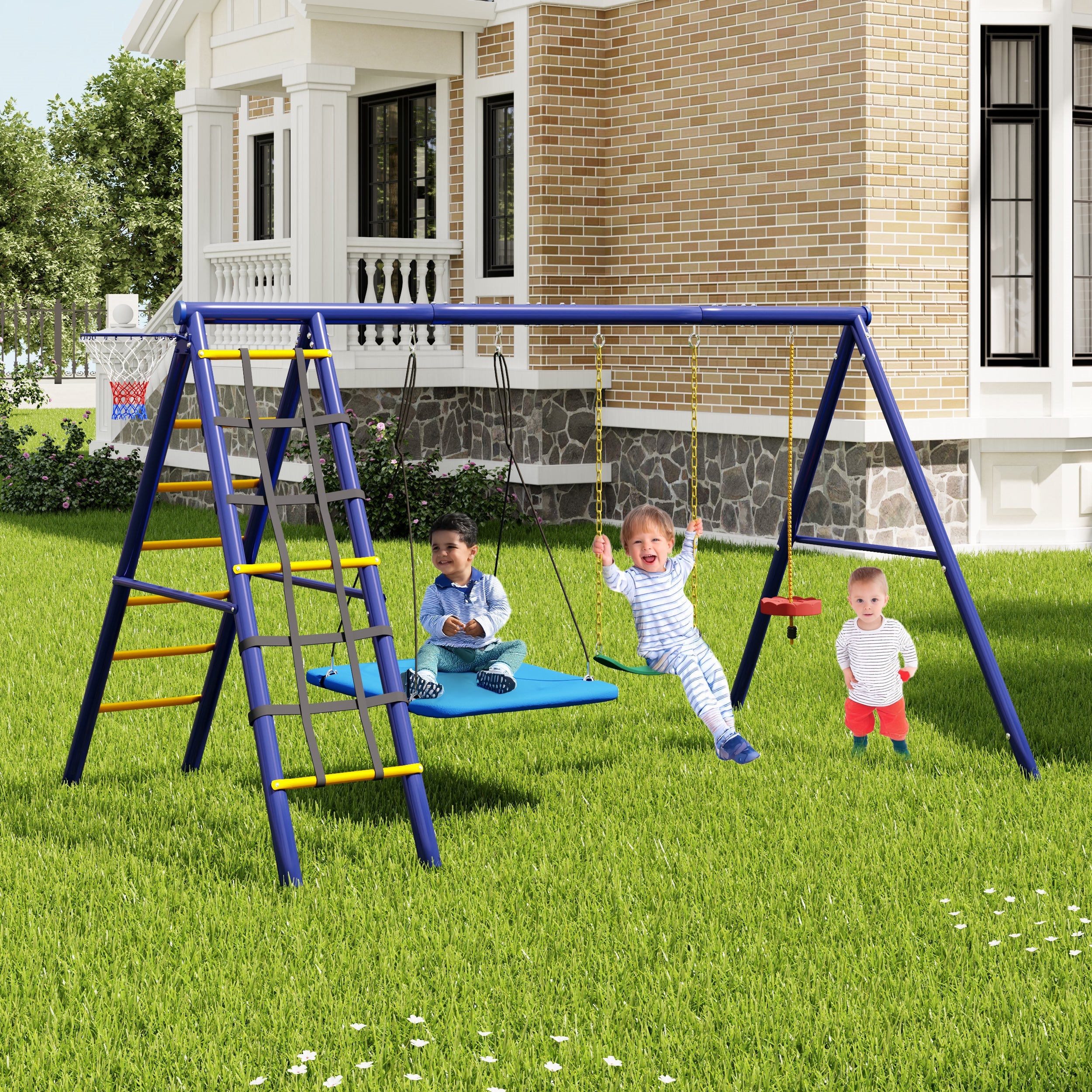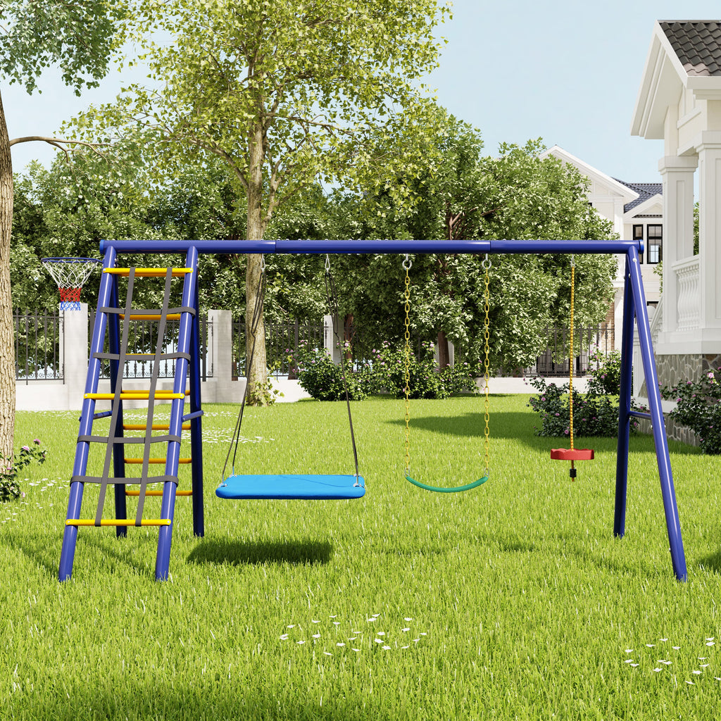 Multifunctional Outdoor Swing Set - 3 Swings, Climbing Frame, Basketball Hoop, Steel