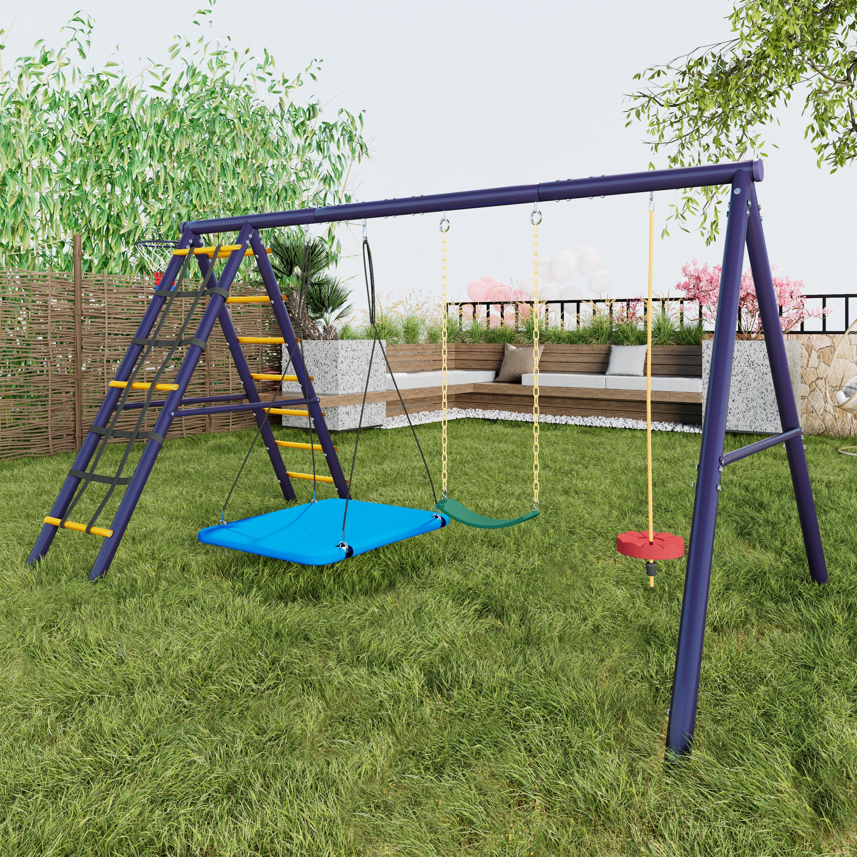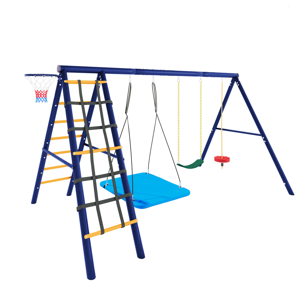 All-in-one design: Includes three swings (hanging plate swing, soft strap swing, climbing rope swing with platform), a climbing frame, and a basketball hoop to meet children's diverse play needs.