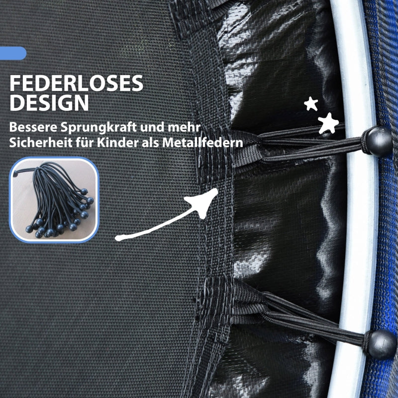 Safe Play: Equipped with padded poles and a safety net, this children's trampoline provides a safe jumping environment by preventing children from falling out while jumping. The innovative rubber spring system replaces traditional steel springs, minimizing the risk of injury.