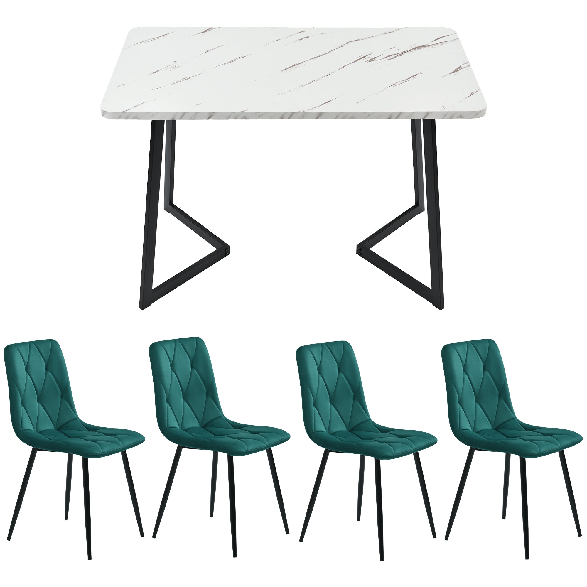 Discover the perfect dining experience with our dining table set\! The chairs, measuring 45 x 40 x 86 cm, feature a deep emerald green color and soft velvet upholstery for a natural feel. The table, measuring 117 x 68 x 75 cm, is made of white MDF with an elegant marble-effect surface and perfectly complements the chairs.