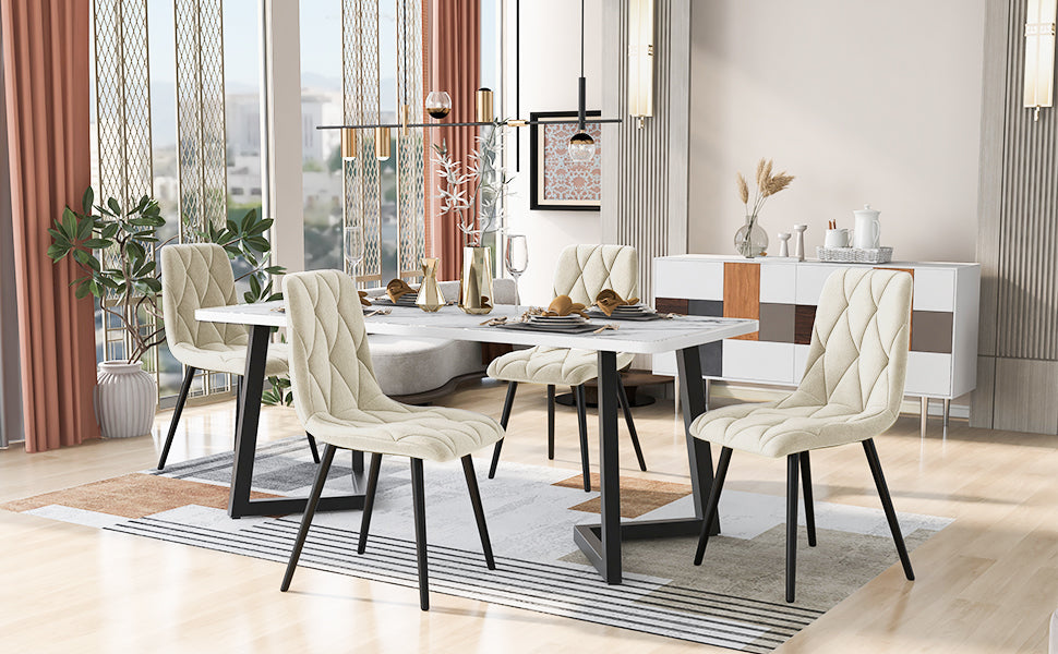Experience timeless elegance with our versatile dining table set. The chairs, measuring 45 x 40 x 86 cm, are upholstered in elegant beige velvet, exuding a touch of luxury. The table, measuring 117 x 68 x 75 cm, features a striking white MDF tabletop with an impressive marble effect that perfectly complements the chairs.