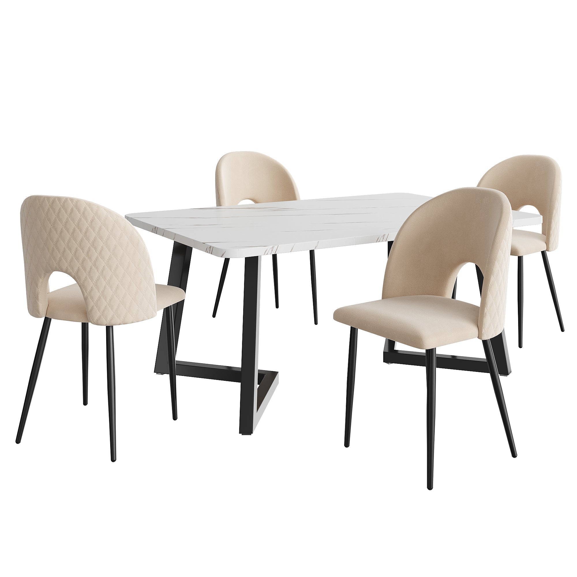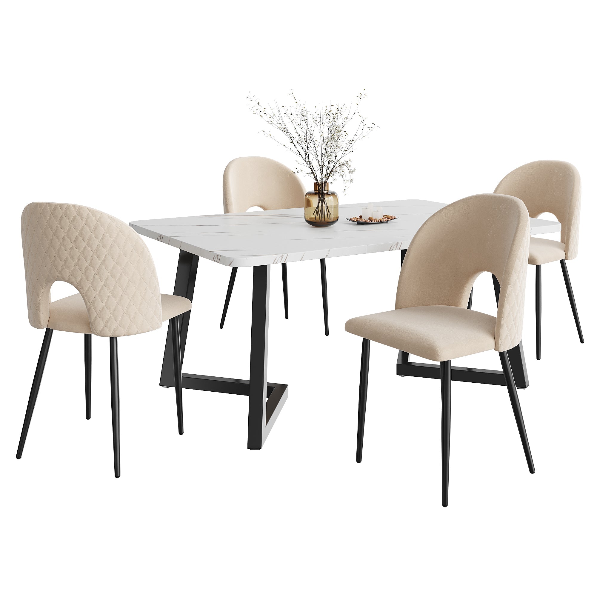 Dining Set 117x68cm Rectangular Table 4 Chairs Velvet Diamond Pattern Beige/Black