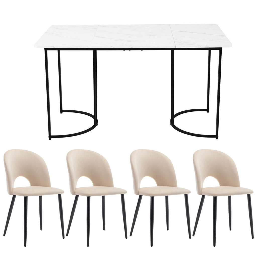 Dining Set, 140x80cm Table with 4 Chairs, Beige Velvet & White MDF