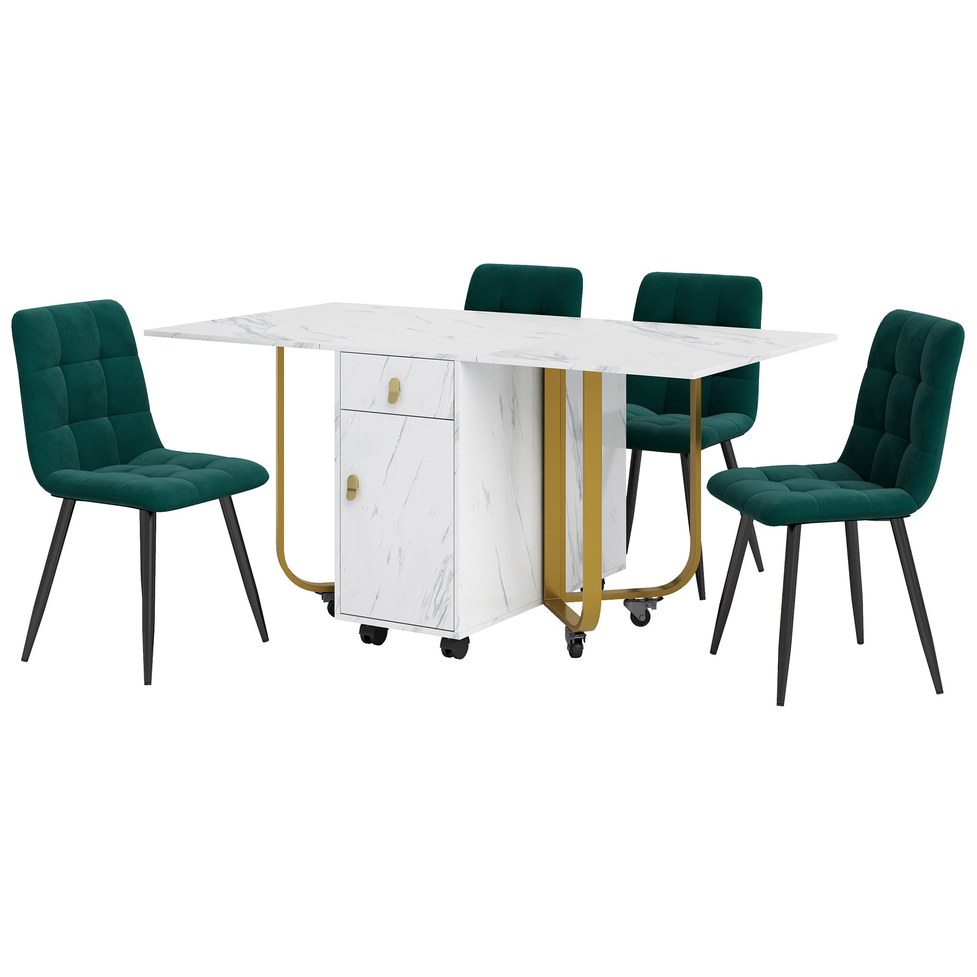 Dining Set, Folding 150cm Table & 4 Velvet Chairs, White MDF/Black Legs