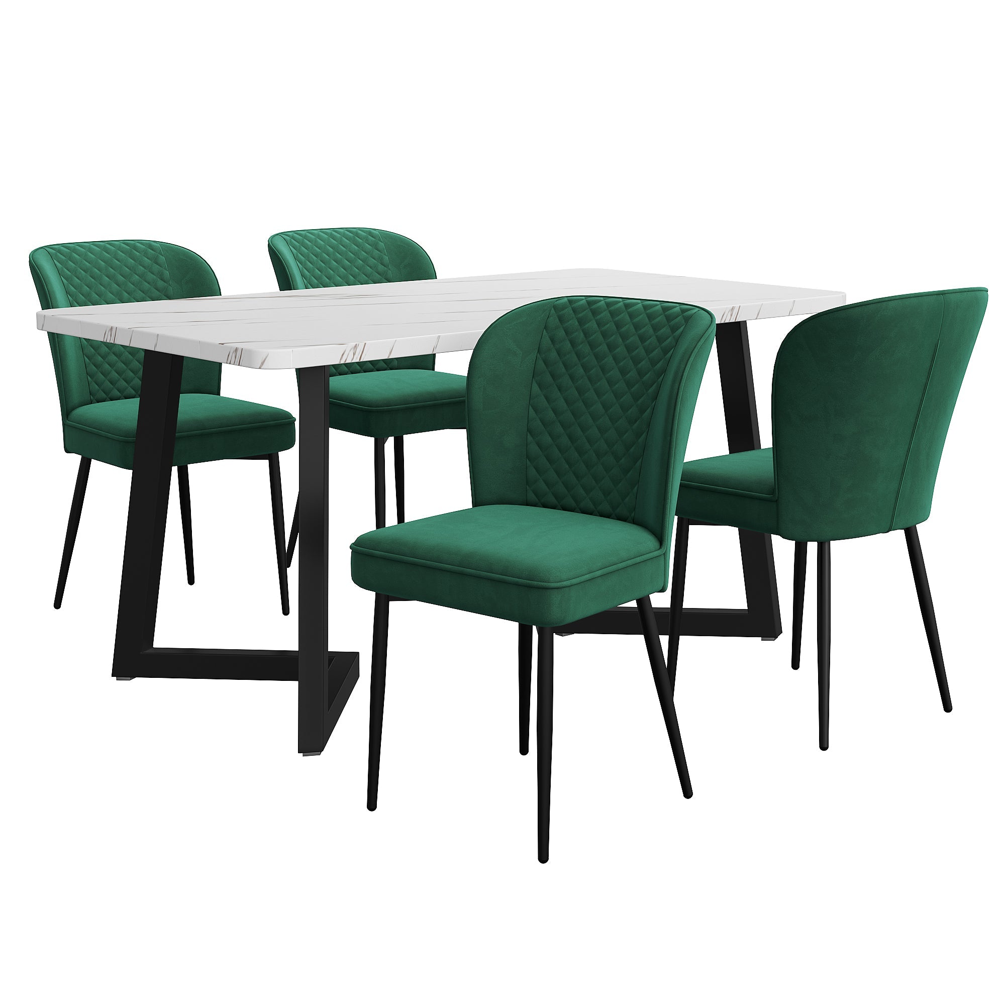 Dining Set with Table (117×68×75cm) & 4 Upholstered Chairs, Dark Green Velvet / White MDF / Black Legs