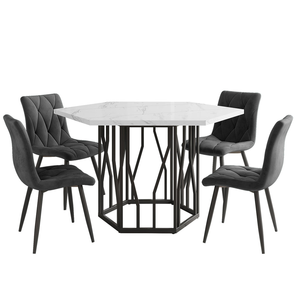 Dining Table and Chair Set, 5-Piece Modern Hexagonal Marble with 4 Gray Velvet Chairs