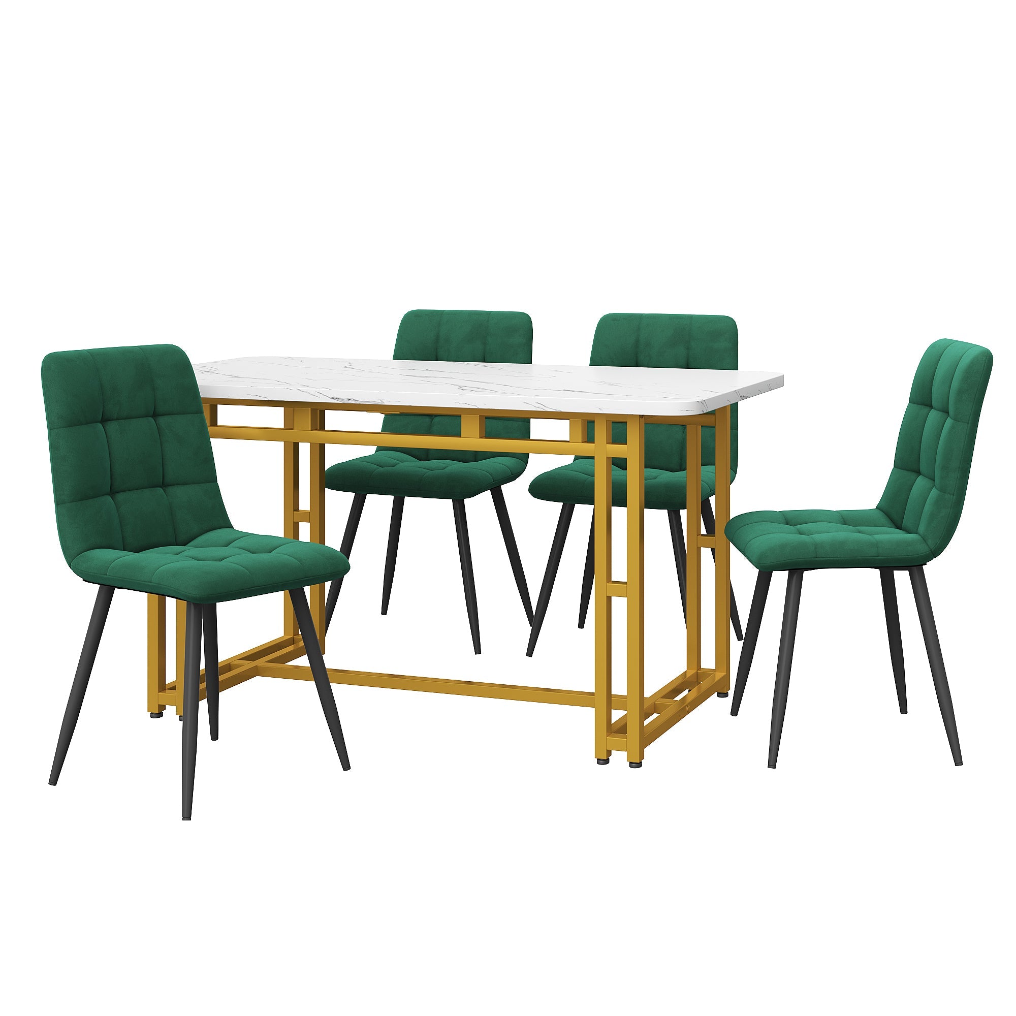 Dining Table Set, 120x70cm with 4 Chairs, Gold & Dark Green Velvet