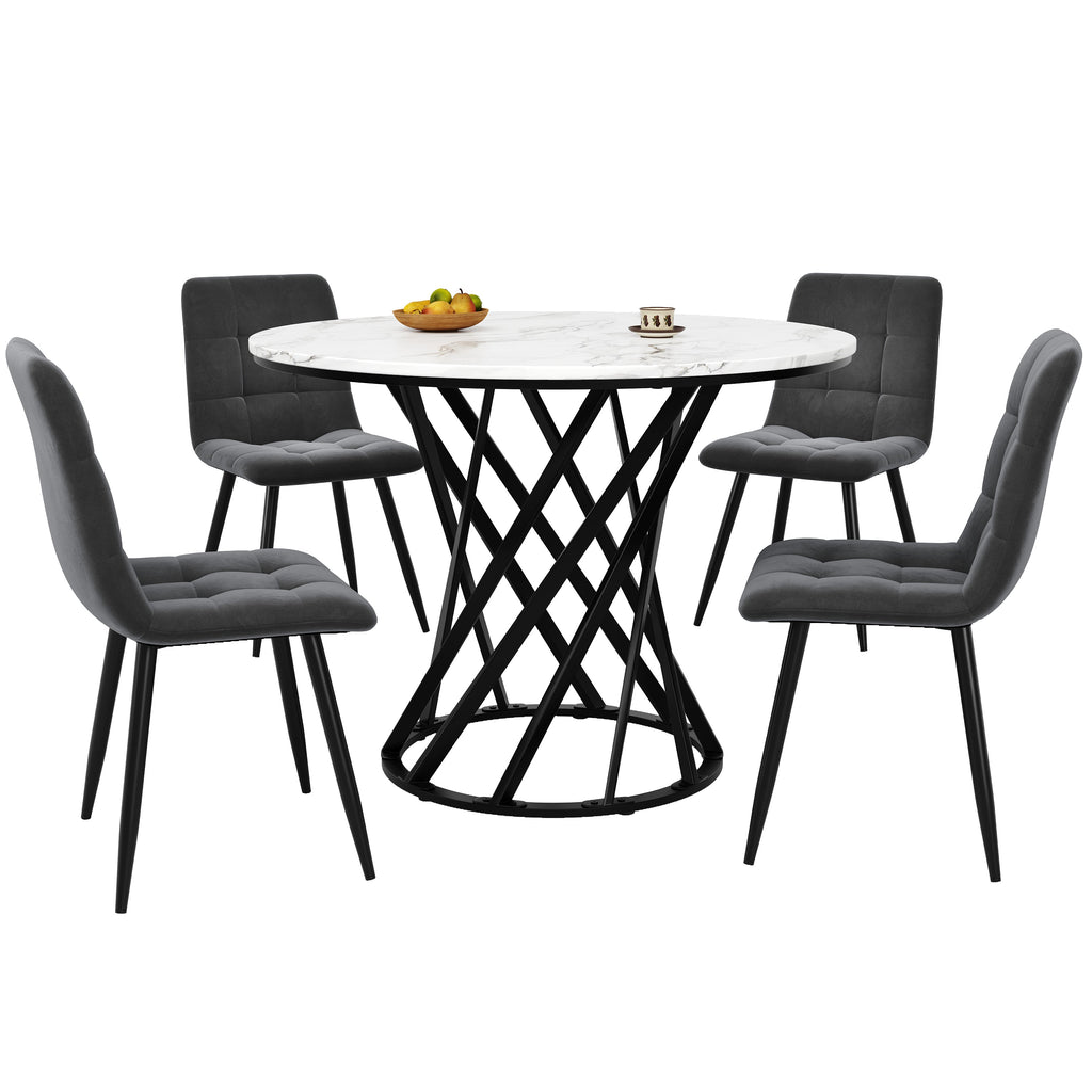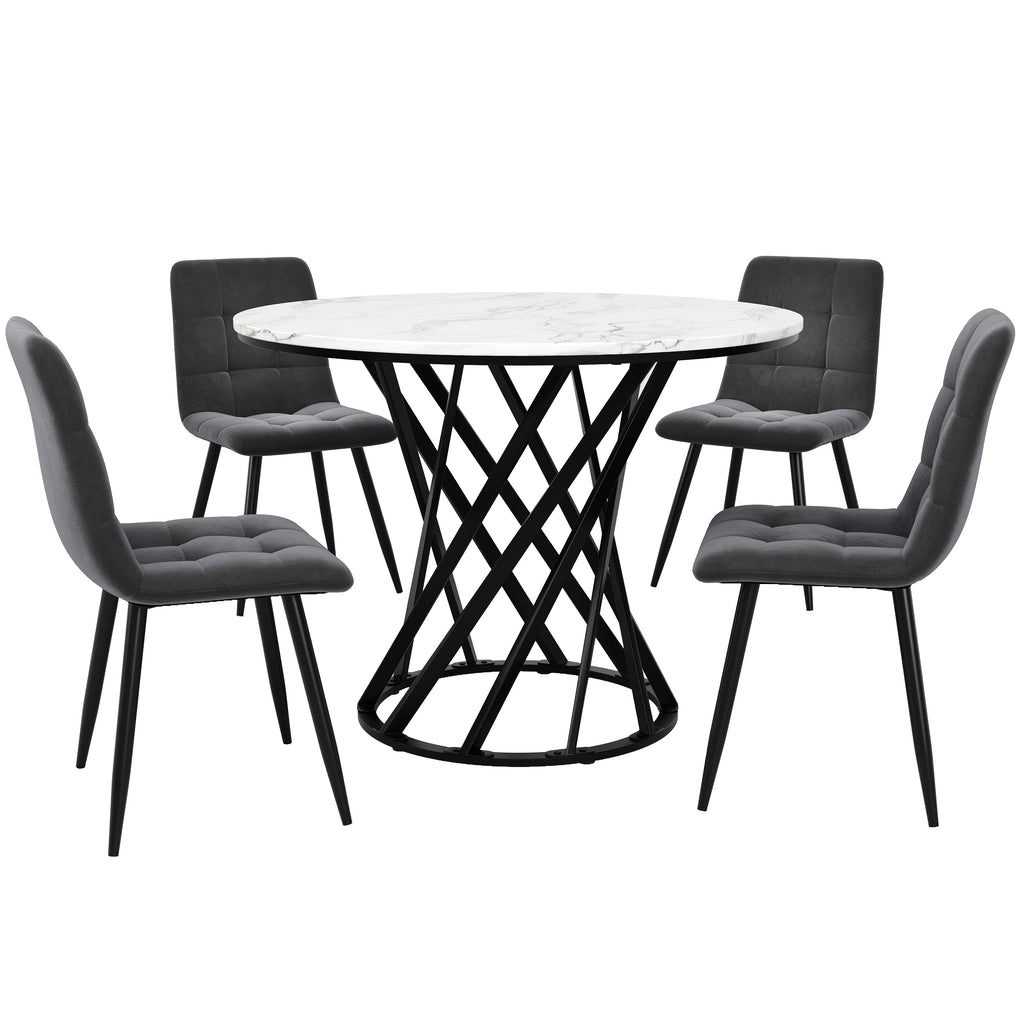 Dining Table Set, 5-Piece Round with 4 Chairs, Black Metal & White MDF, Velvet