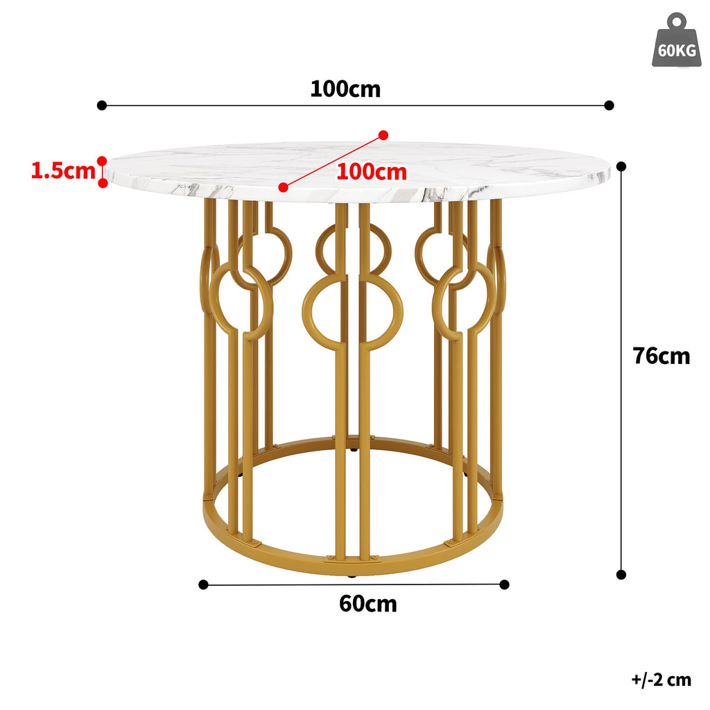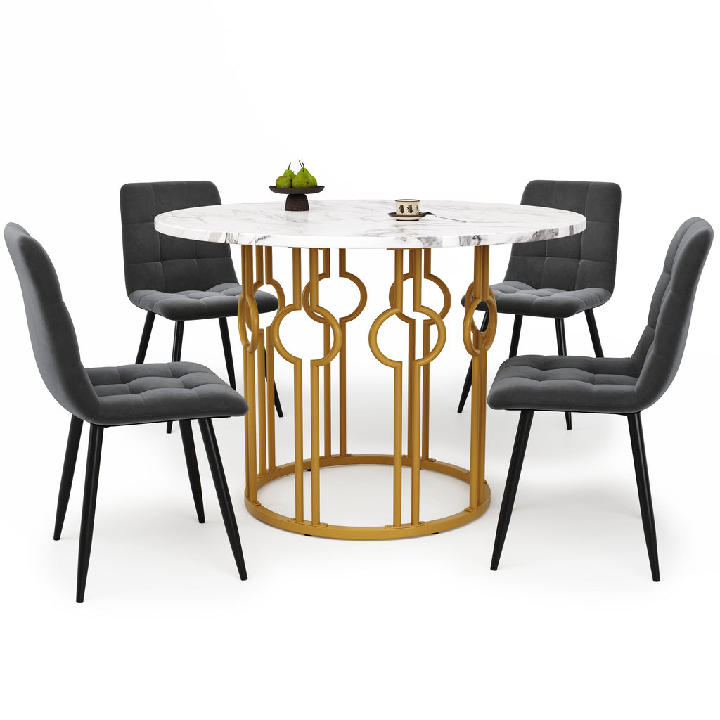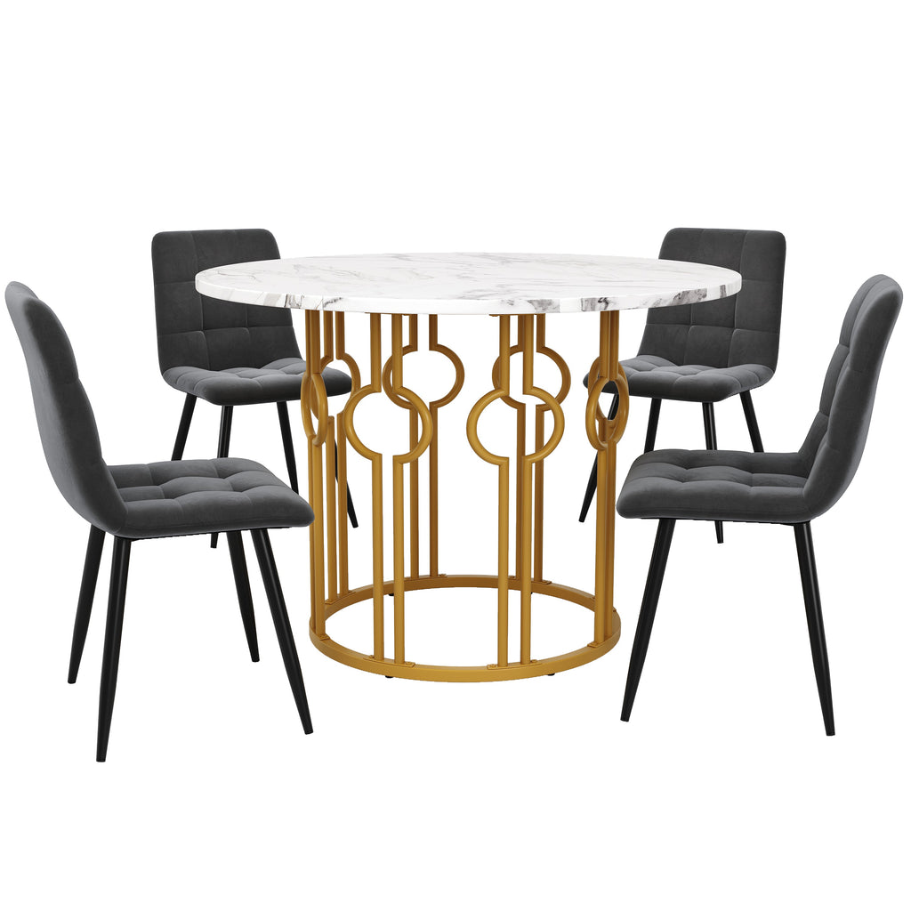 Dining Table Set, 5 Piece Round with 4 Chairs, Gold Legs, White MDF & Dark Grey Velvet