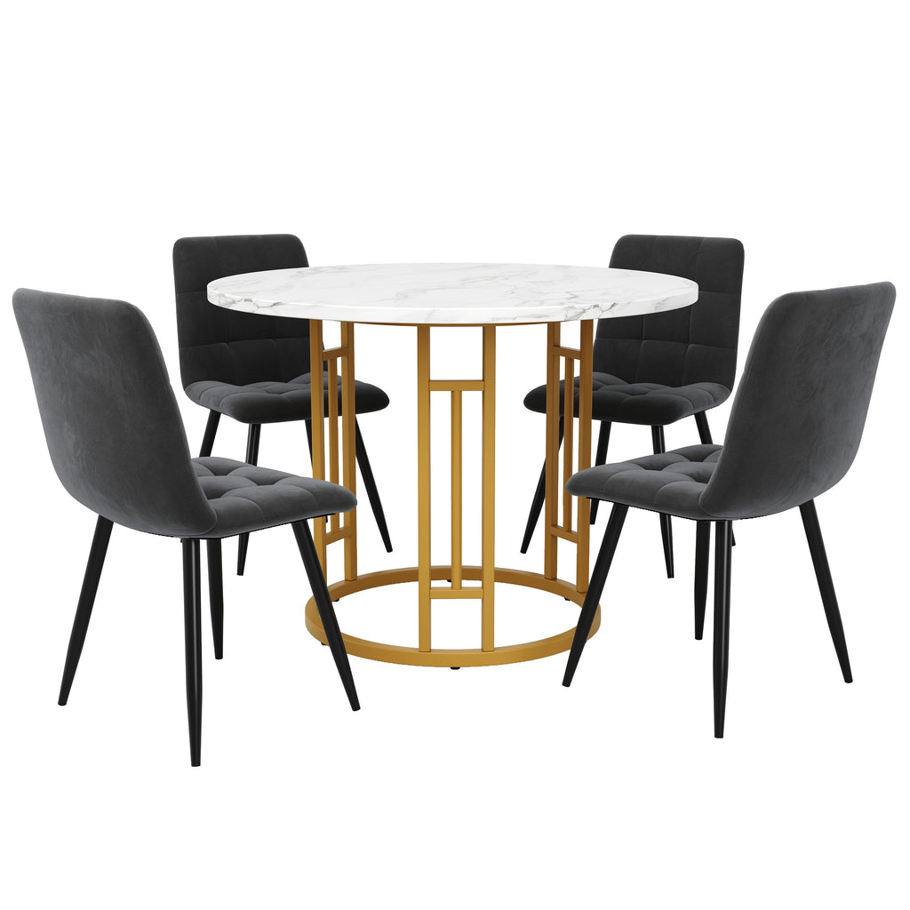 Dining Table Set, 5-Piece Round with 4 Chairs, Gold Metal Legs, Grey MDF Marble