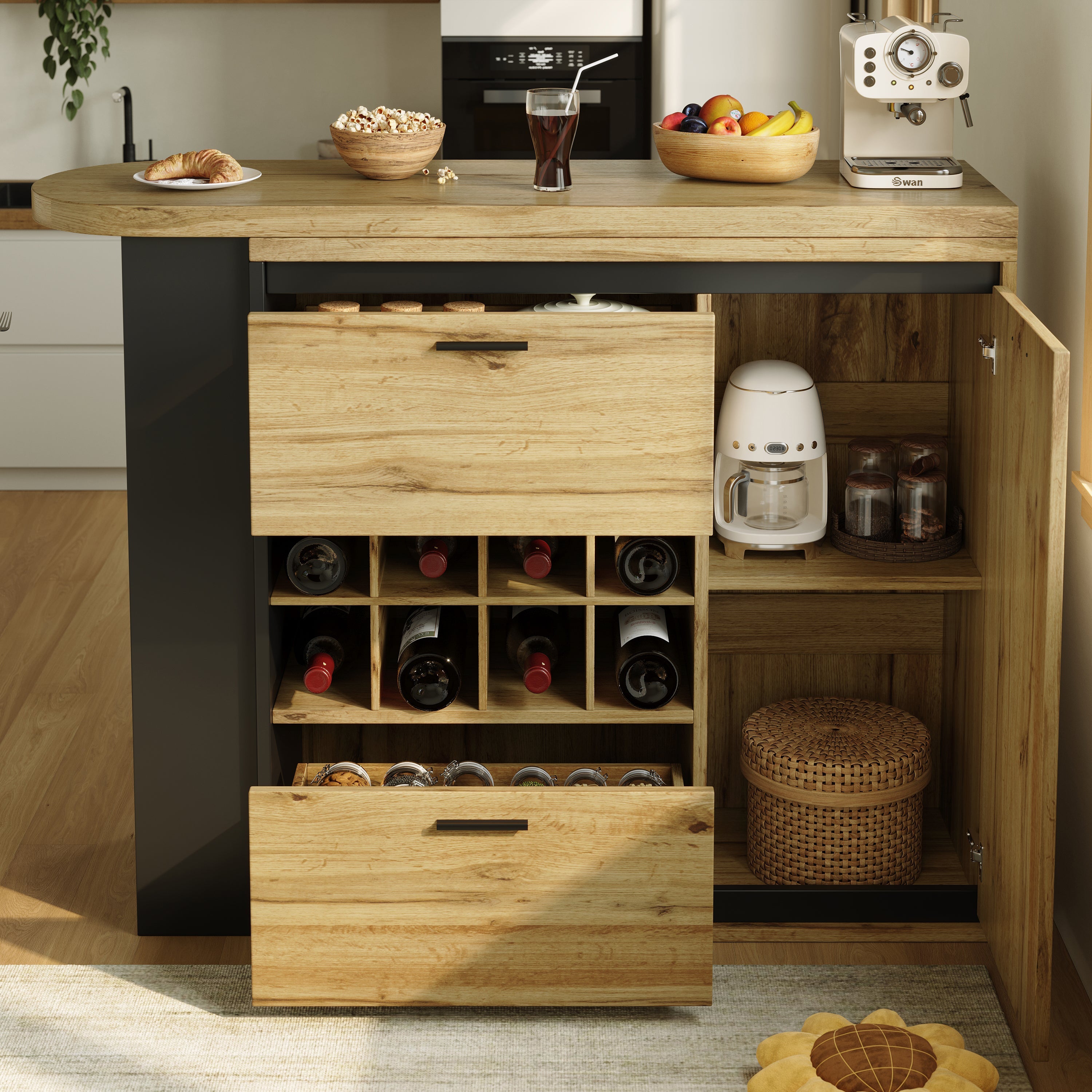 The cabinet features two large drawers, a wine rack, and a separate storage compartment. The extended tabletop has open shelves that maximize storage capacity and meet a variety of organizational needs.