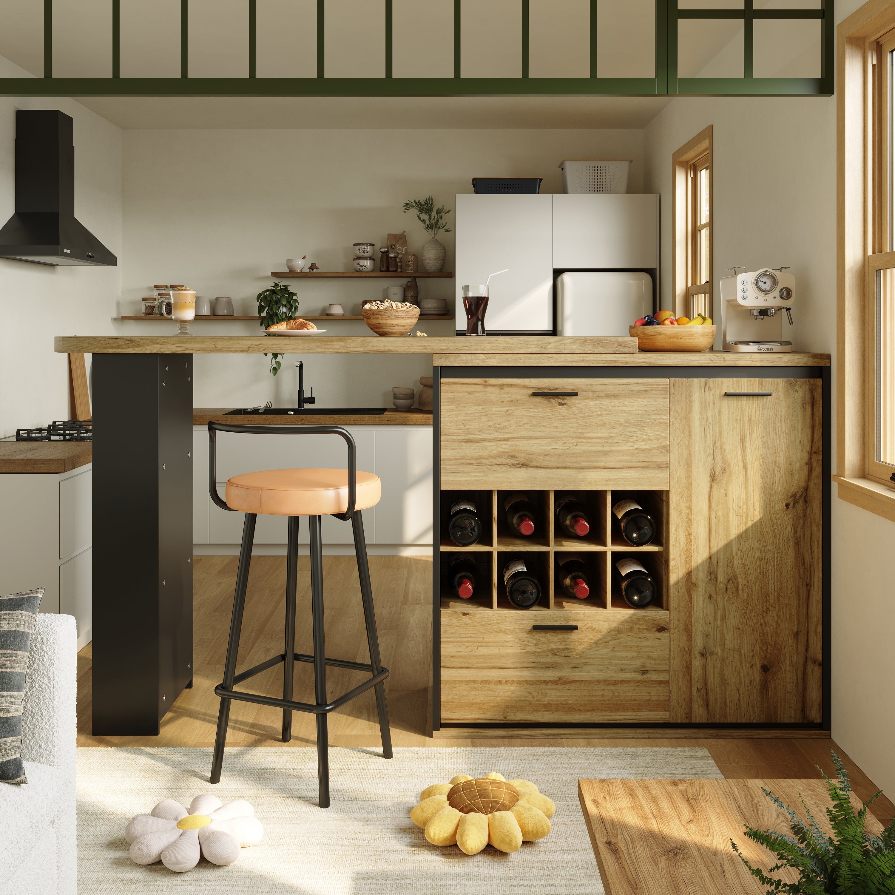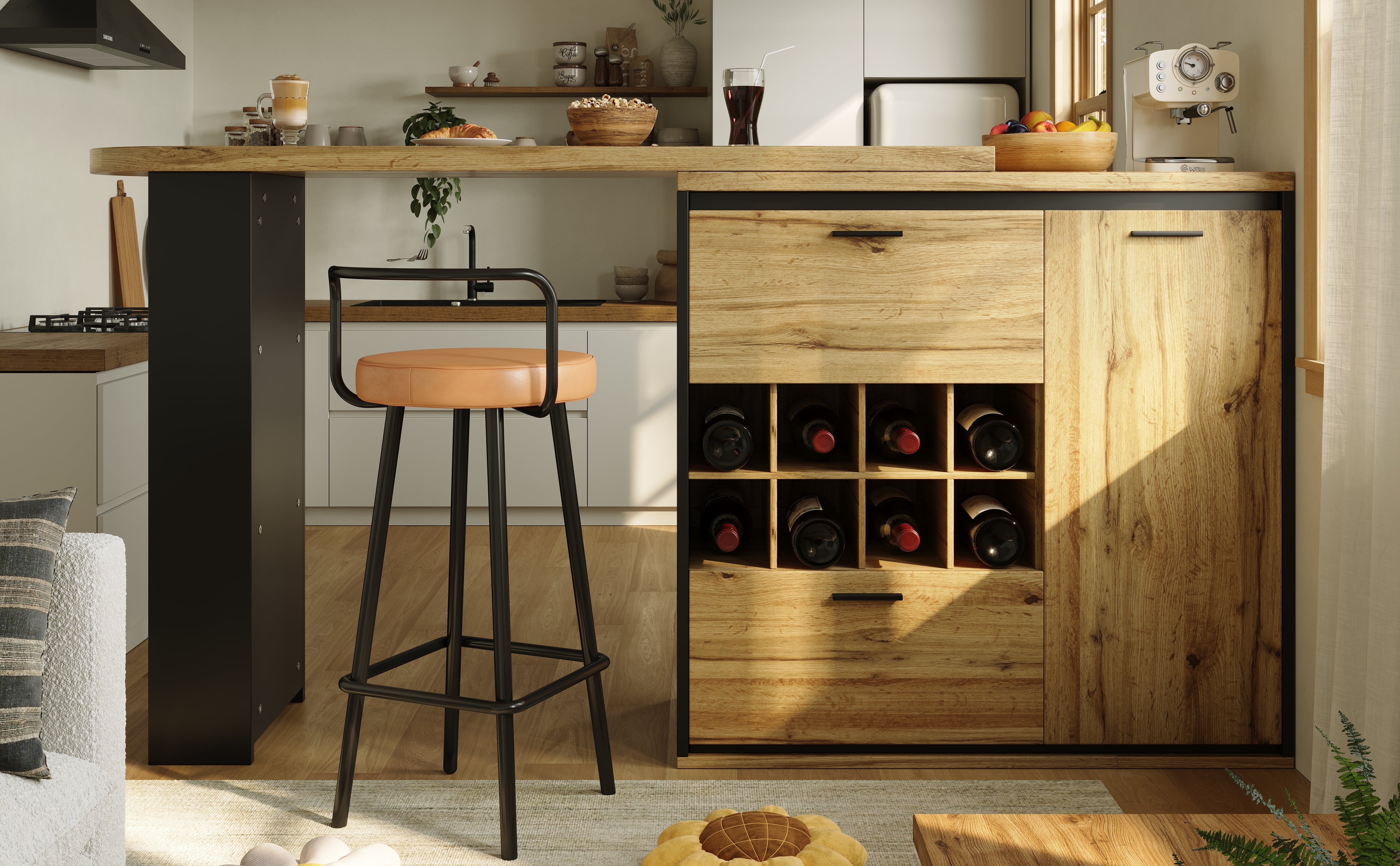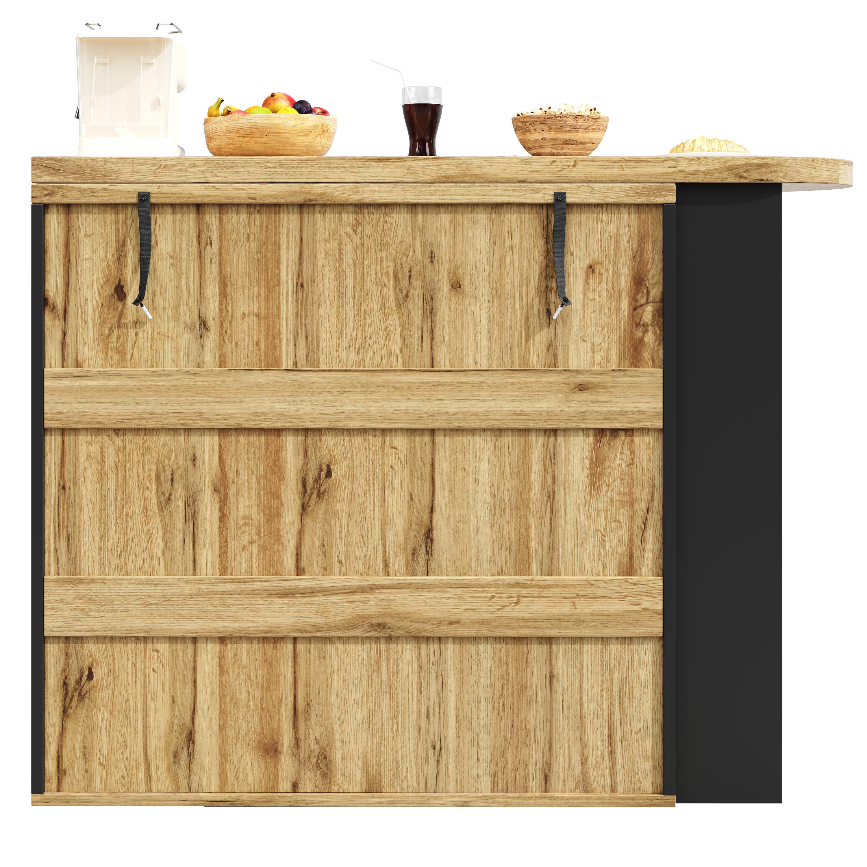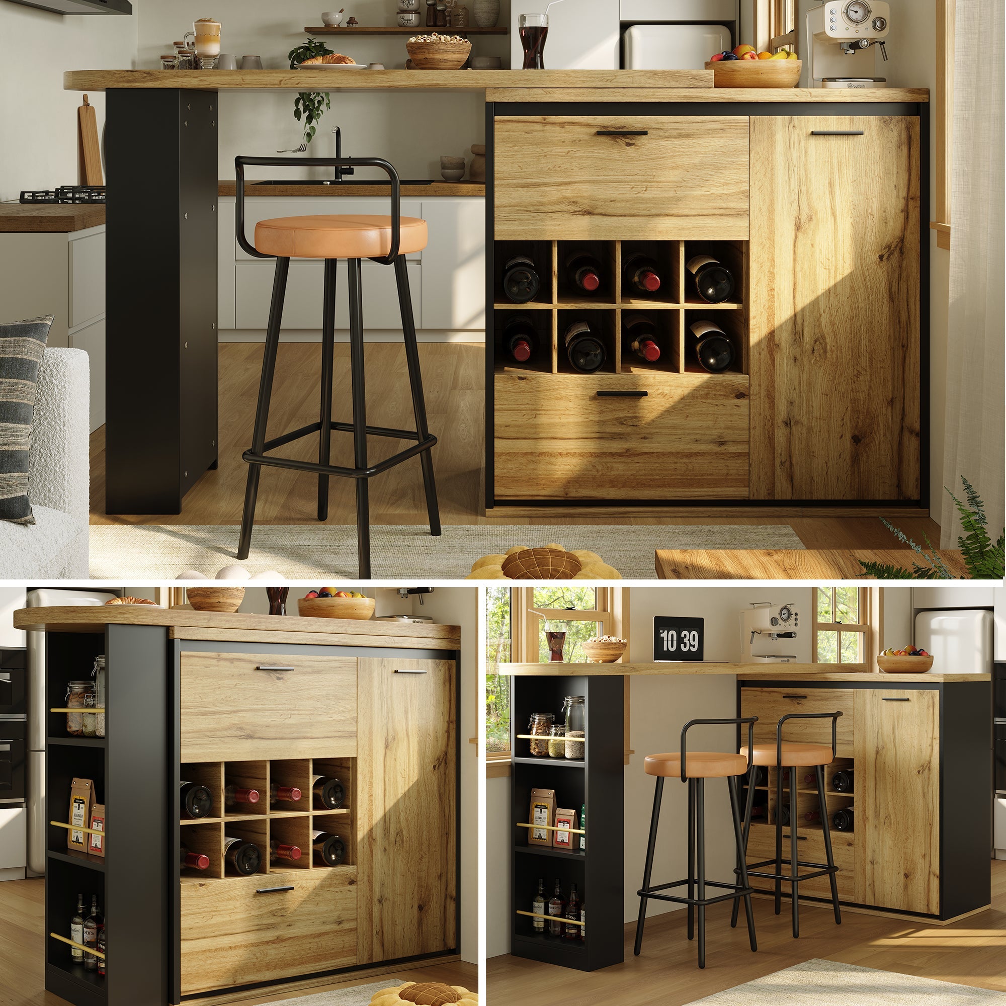 The extension leaf can be flexibly positioned to adapt to any environment. It functions as a bar table or corner storage unit, adapting to a variety of needs.