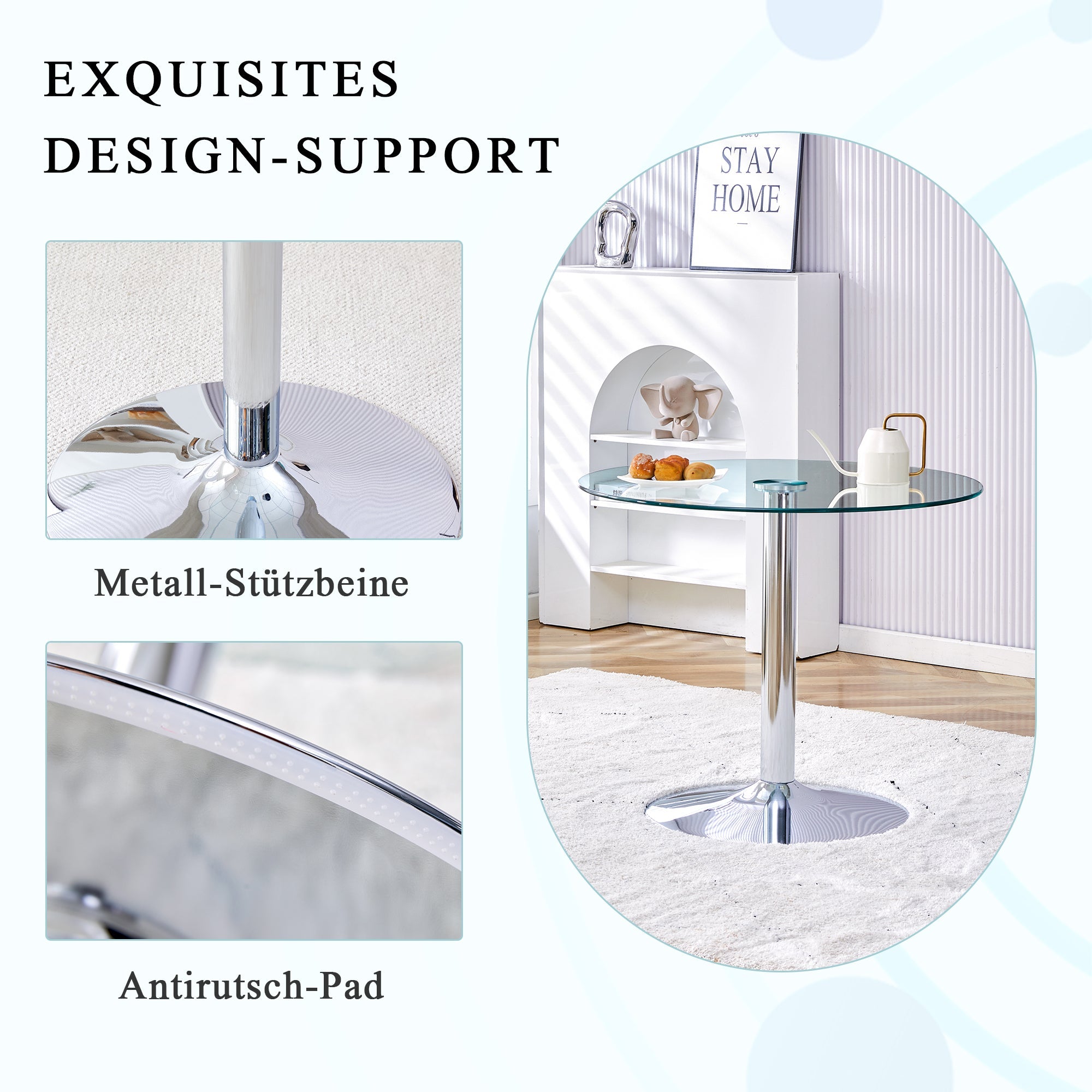 The glass tabletop is smooth and polished, and the metal base has a scratch-resistant and wear-resistant finish. Accidental spills, such as drinks or alcohol, can be easily cleaned without special cleaning agents, saving time and effort.