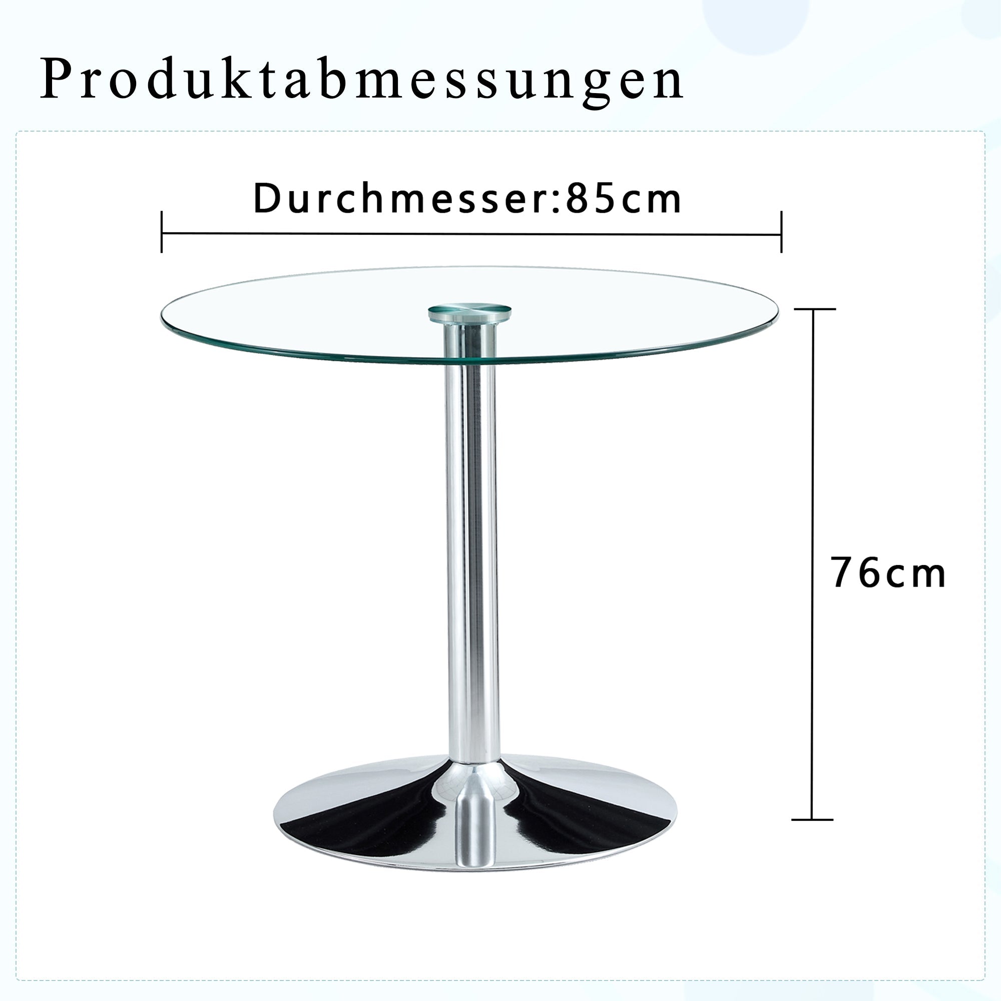 The tabletop has a total height of 76 cm and a diameter of 85 cm. This size is ergonomically designed and comfortable for placing items and using while seated. It also does not take up too much space and is suitable for various room layouts.