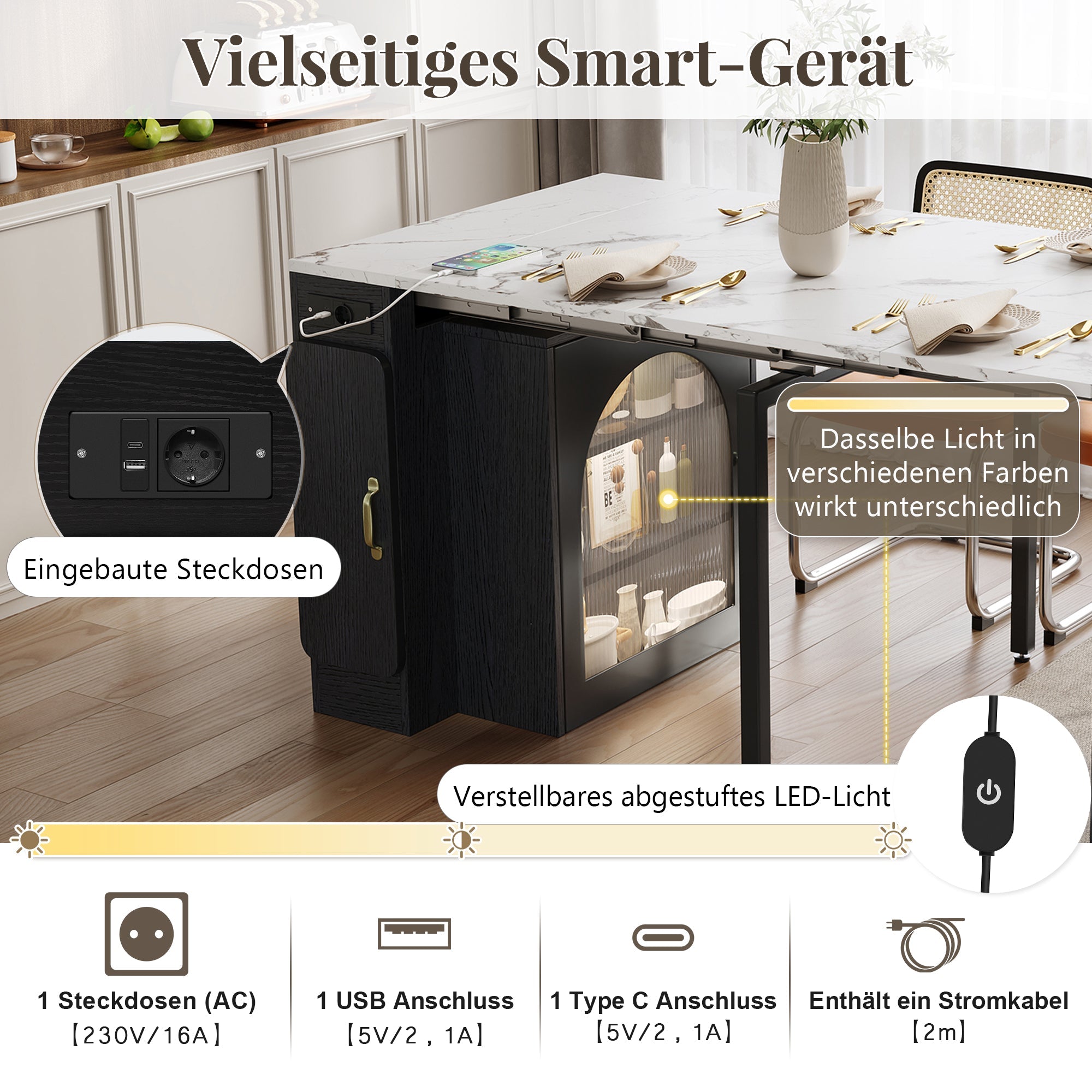 Color-gradient LED lighting creates a cozy atmosphere, with different colors producing different effects. A multifunctional USB/Type-C power outlet charges devices directly. This makes it perfect for modern, smart interiors as a dining table or kitchen island with practical tech features.
