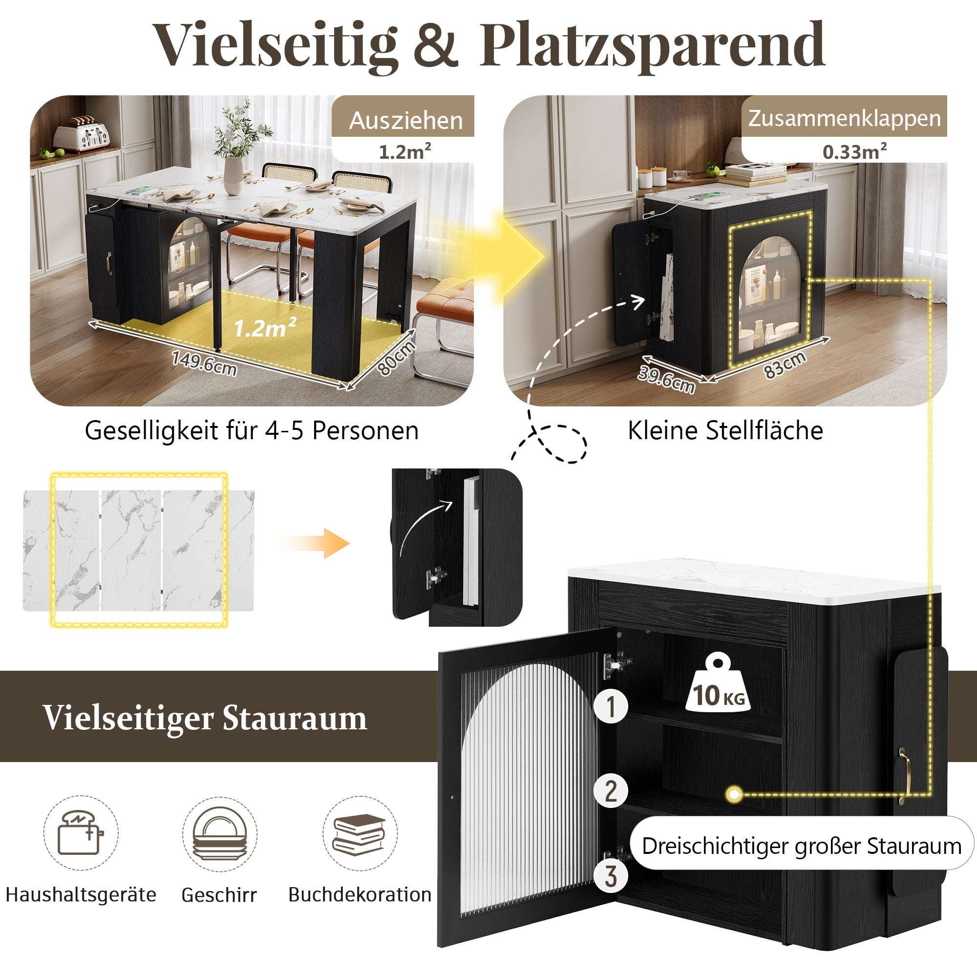 This multifunctional table features three tabletops, allowing for extension and flexible adaptation to different scenarios. Hidden casters ensure effortless movement, and snap locks provide secure closure. The extendable dining table offers three usage modes: one top for solo dining, two for romantic dinners, and three for gatherings of four. It can also be used as a space-saving sideboard or wall-mounted sideboard, making it perfect for all family situations.