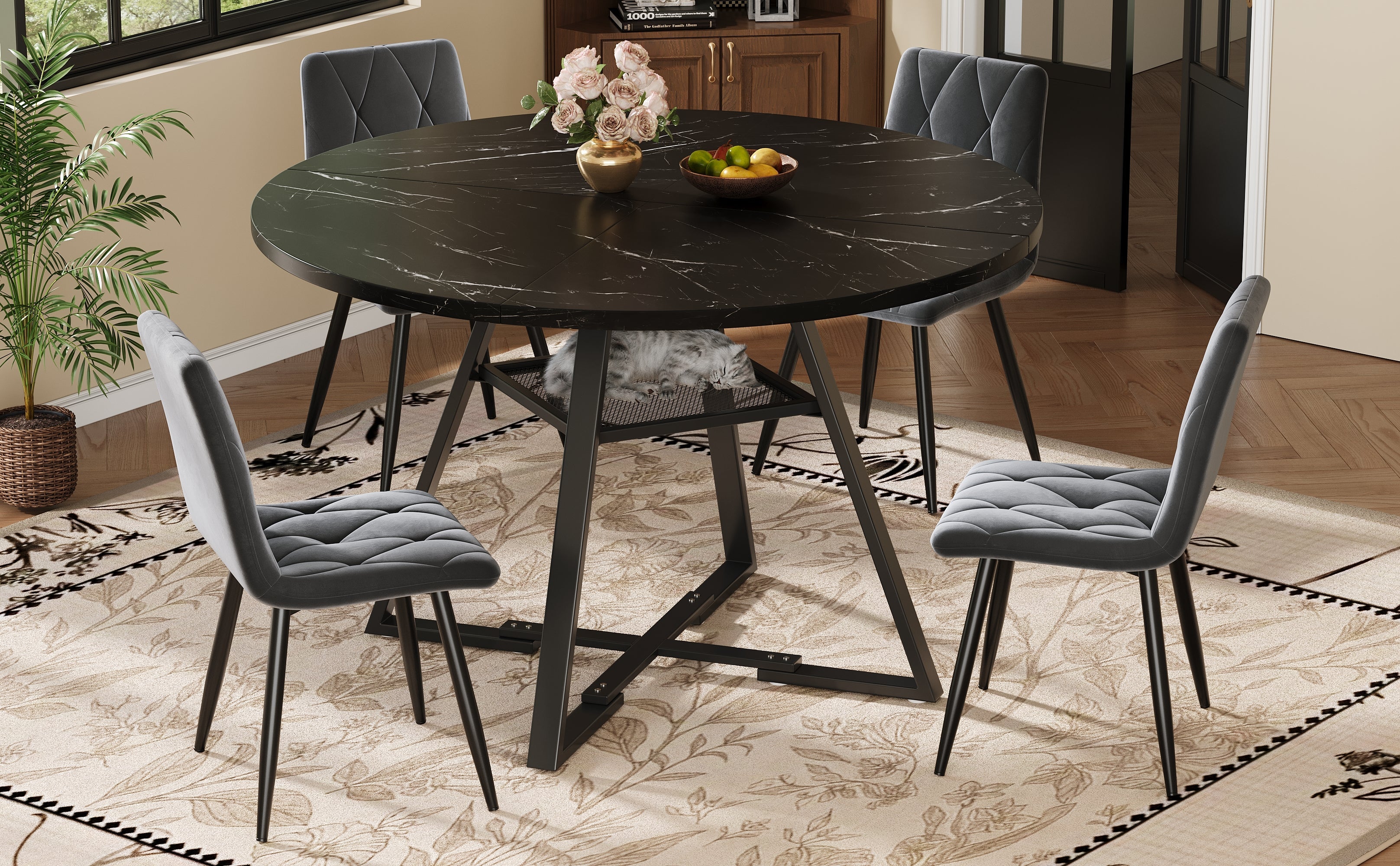Round Dining Table Breakfast Metal Legs Marble Look, Black/White