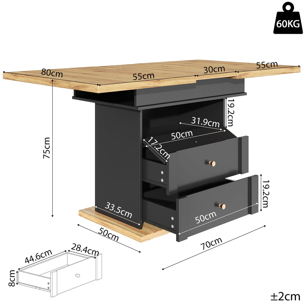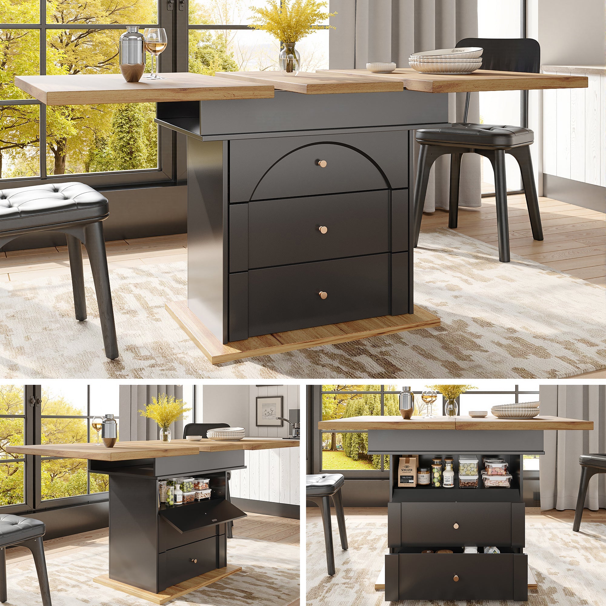 Thanks to the innovative transformation system, this table can be effortlessly converted from a compact to an extended size, ideally adapting to a variety of room situations. The unique two-sided extension system is easy to use: simply pull the sides and insert the extension leaf to increase the work surface. The decorative table surface is not only pleasing to the eye but also scratch-resistant and easy to clean. Hidden storage areas and adjustable components offer flexible organization options, while the sturdy substructure guarantees long-term stability. Whether as a dining table, workstation, or presentation surface, this piece of furniture is a must-have for modern, multifunctional living.