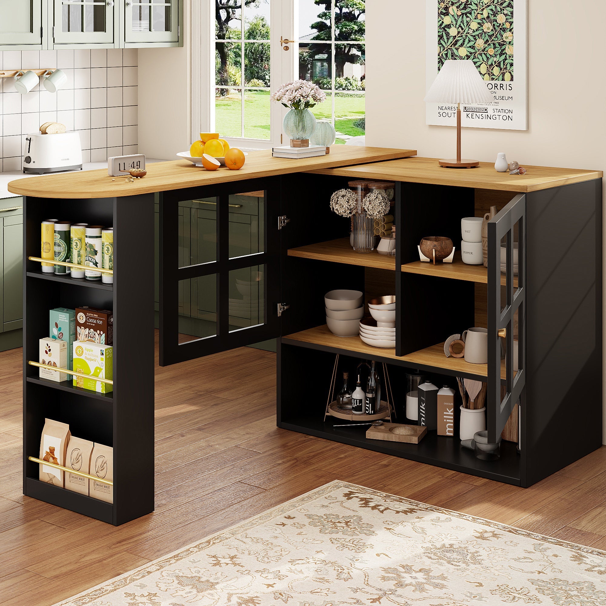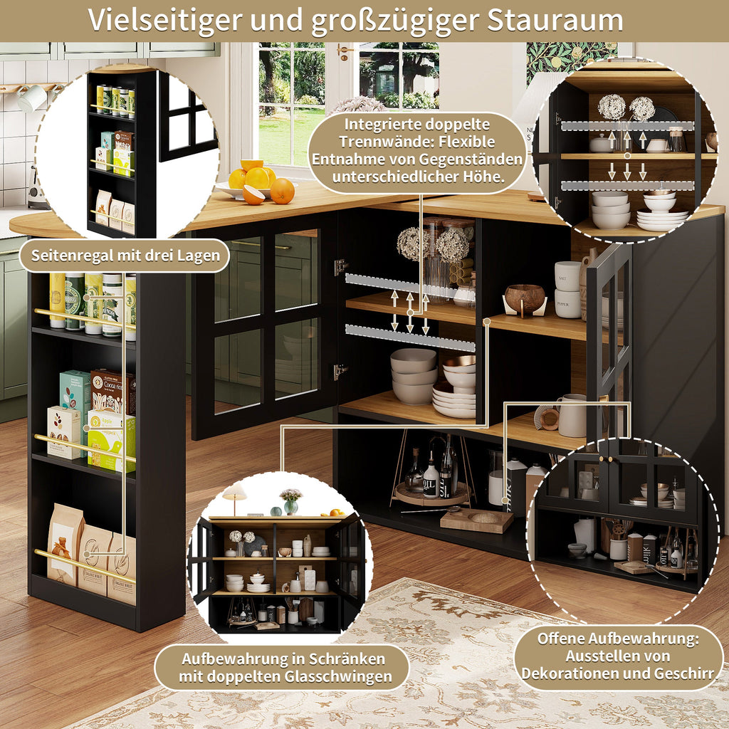 The snack rack includes three side shelves, allowing you to organize items by category. For example, the bottom shelf can hold large packaged ingredients, the middle shelf can store frequently used canned goods, and the top shelf is perfect for small spices. This design facilitates efficient classification and retrieval of your items. The tempered glass door arch features three built-in layers of adjustable, movable dividers, enabling flexible adjustment of the compartment space to accommodate items of various heights. Whether you have tall vases or short bowls and plates, this design ensures everything finds a suitable place, maximizing space utilization.