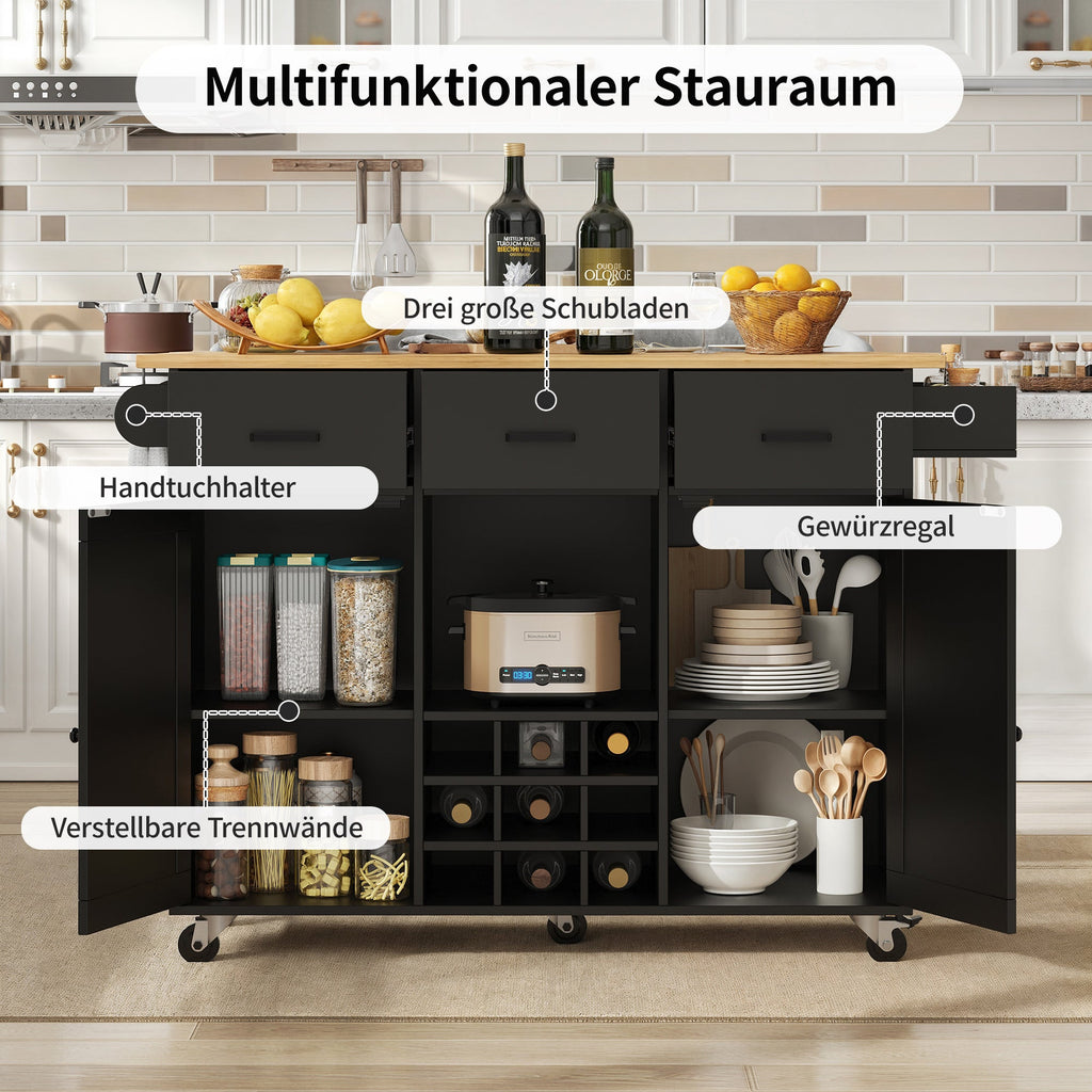 The cabinet offers multifunctional storage space with shelves that can be adjusted to three positions to accommodate items of various heights. This cutlery cart includes three drawers, two cabinet doors, a wine rack, and open compartments for ample storage.