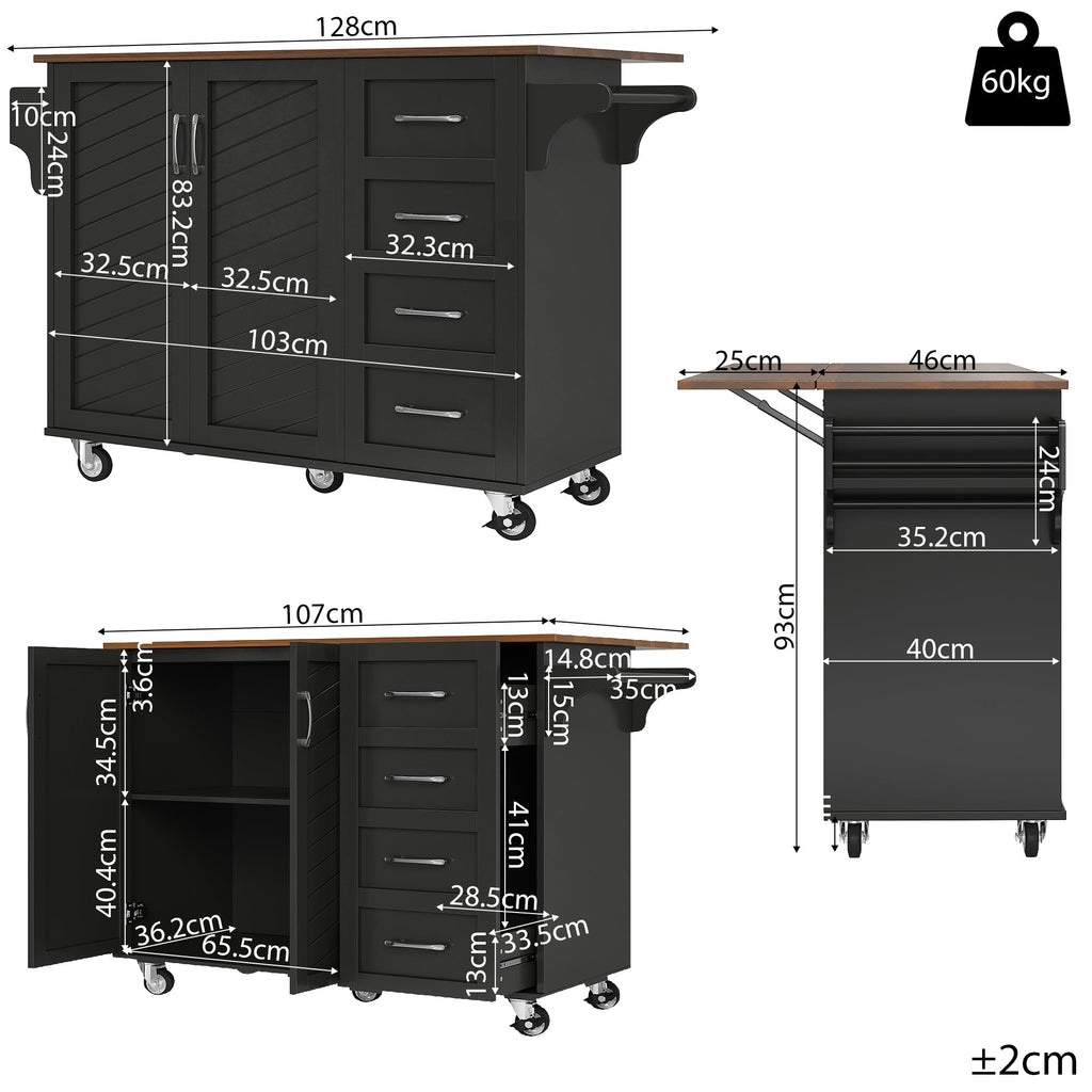 This kitchen cart features a foldable tabletop that extends up to 71 cm, providing a comfortable dining space. The metal frame and lockable wheels ensure quality and stability.