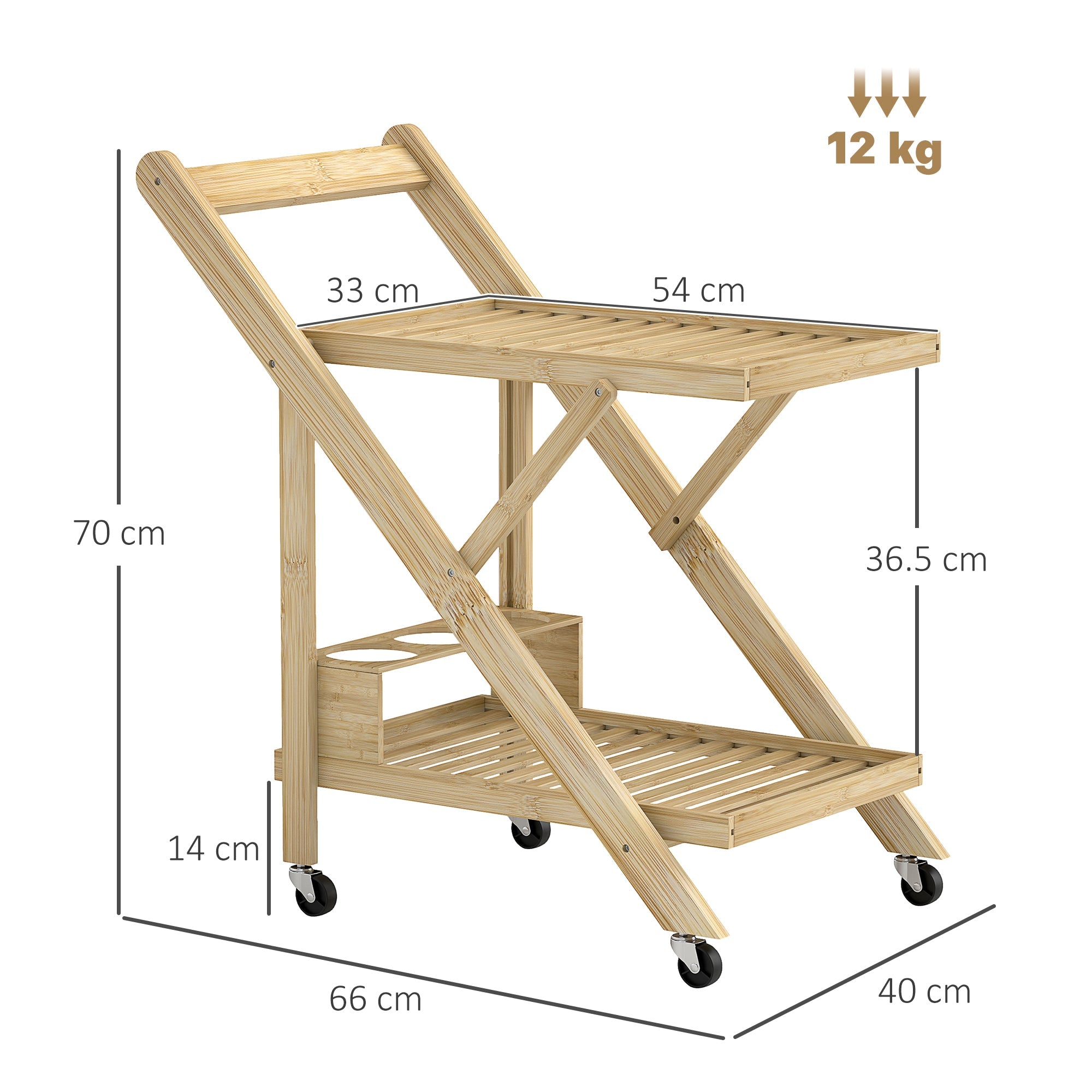 Product dimensions of the shelf with wheels: 66W x 40D x 70H cm. Weight capacity: 12 kg total, 4 kg per shelf and wine rack. Assembly required.