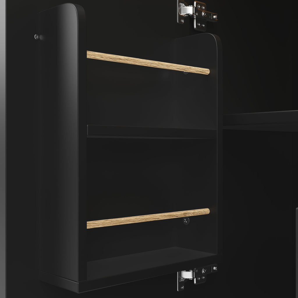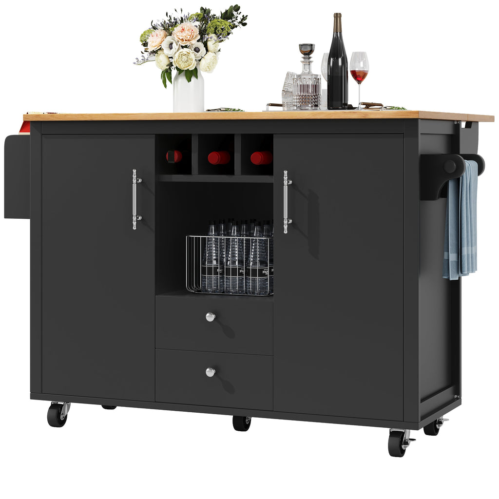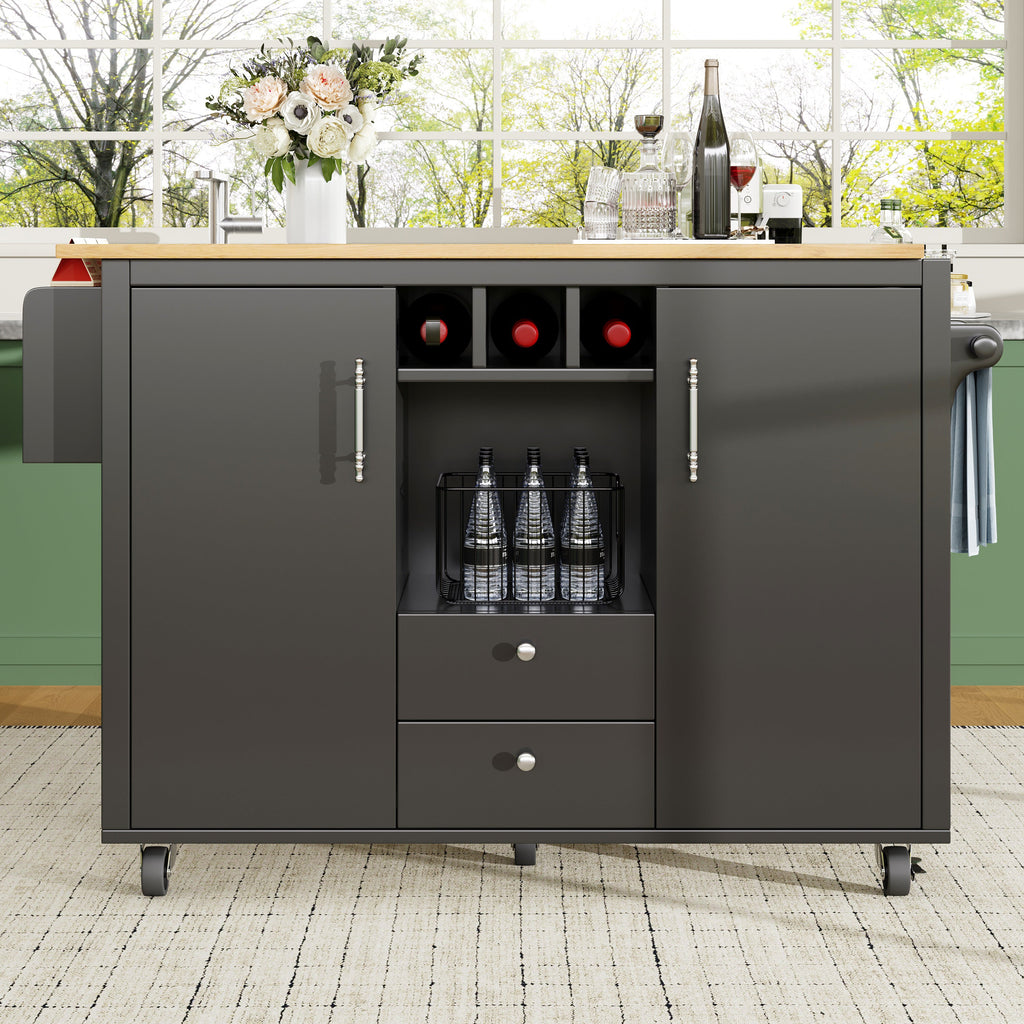 Large Storage Space: This kitchen island features two drawers, double doors with door shelves, and separate compartments for various storage needs. It also includes wine racks, open compartments, and towel and spice racks on both sides, ensuring convenience and efficiency in your kitchen.